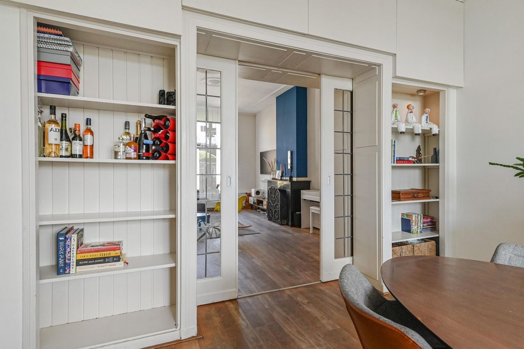 2e verdieping; overloop met toegang tot alle vertrekken op deze verdieping, gezellige ruime woon-eetkamer met schouw, fraaie parket-laminaatvloer, suite separatie naar de achterkamer met een schuifpui naar een vergroot terras grenzend aan de woonkamer. Moderne luxe keuken in een U- opstelling en uitgevoerd met alle apparatuur waaronder een grote inductie kookplaat, afzuigkap, combi magnetron, oven, koelkast, vrieskast, vaatwasser en Quooker.
