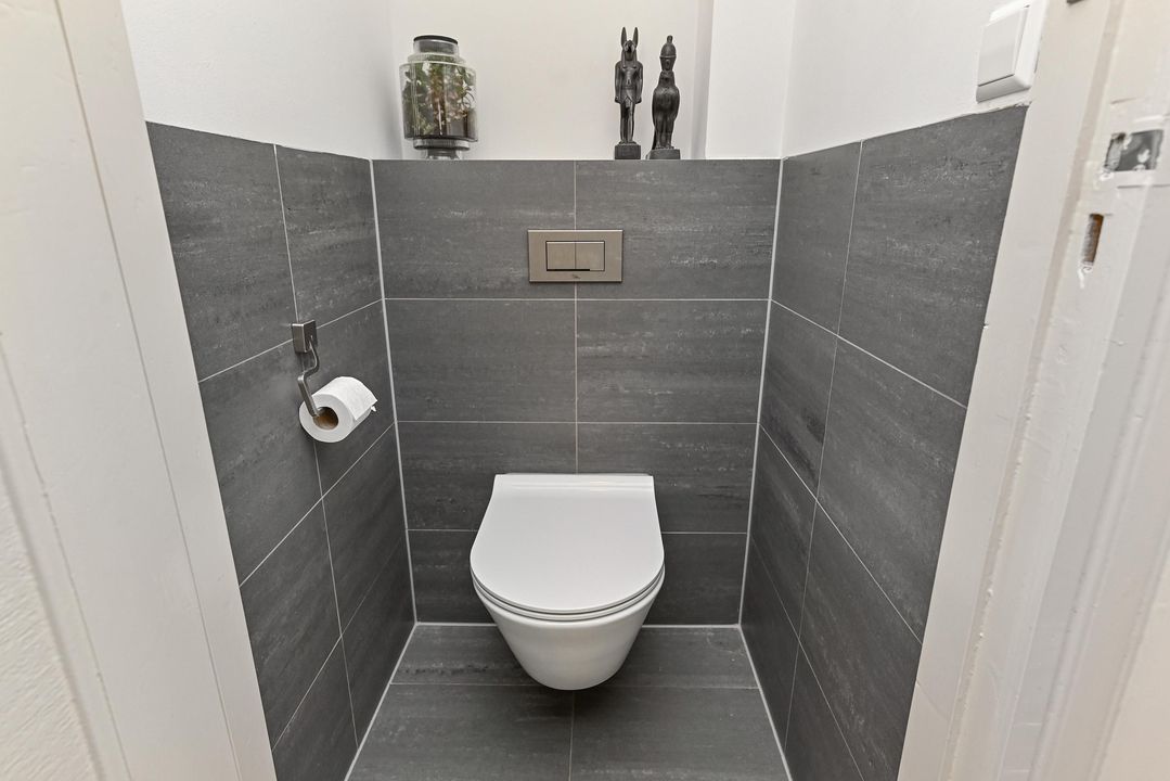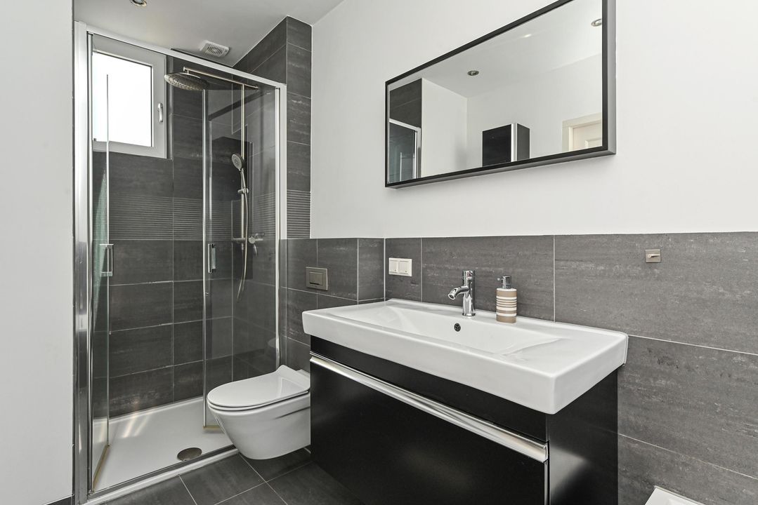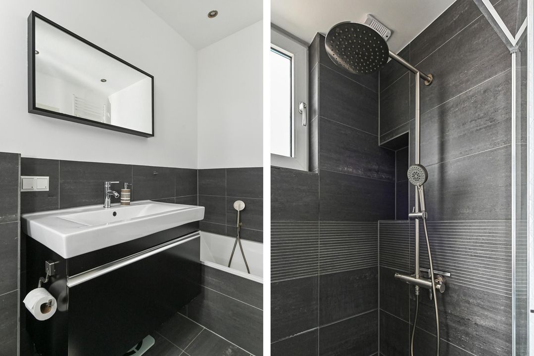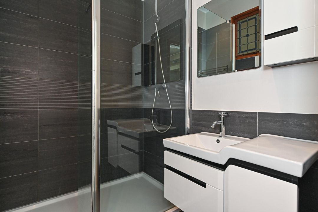 De badkamer op deze verdieping is modern en uitgevoerd met wastafelmeubel en een inloopdouche. Een vaste kast onder de trap is waar de opstelplek is voor de c.v. combi ketel Intergas HRe.