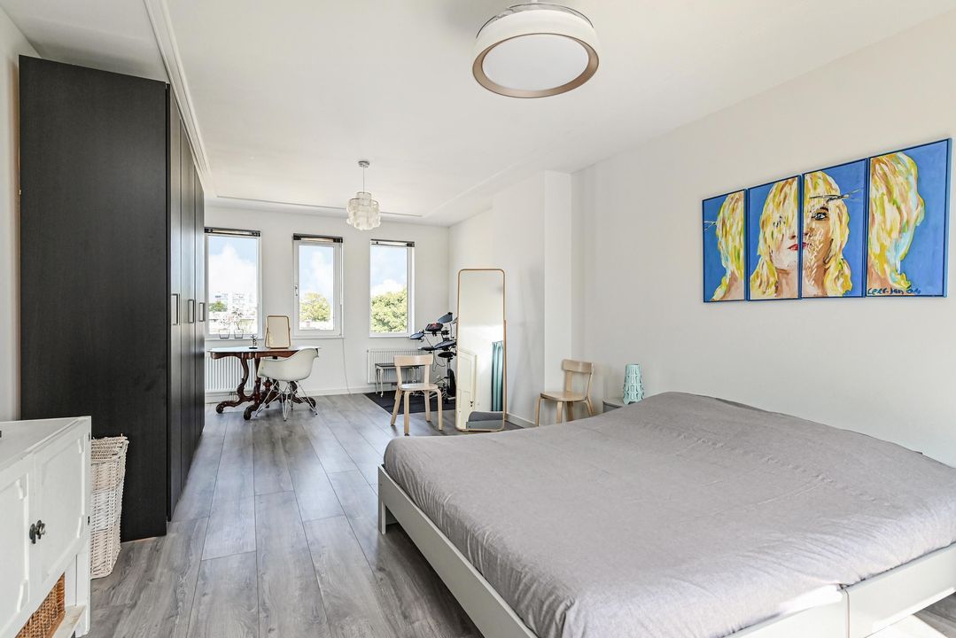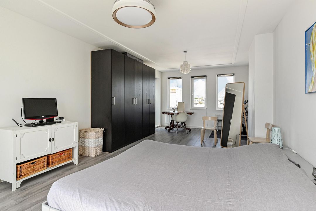 De riante hoofdslaapkamer (eventueel op te splitsen in twee kamers), met moderne laminaatvloer, grenst tevens aan de hal en geeft toegang tot zowel het voorbalkon als het dakterras.