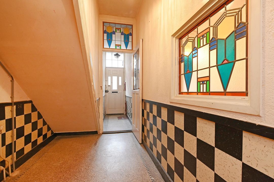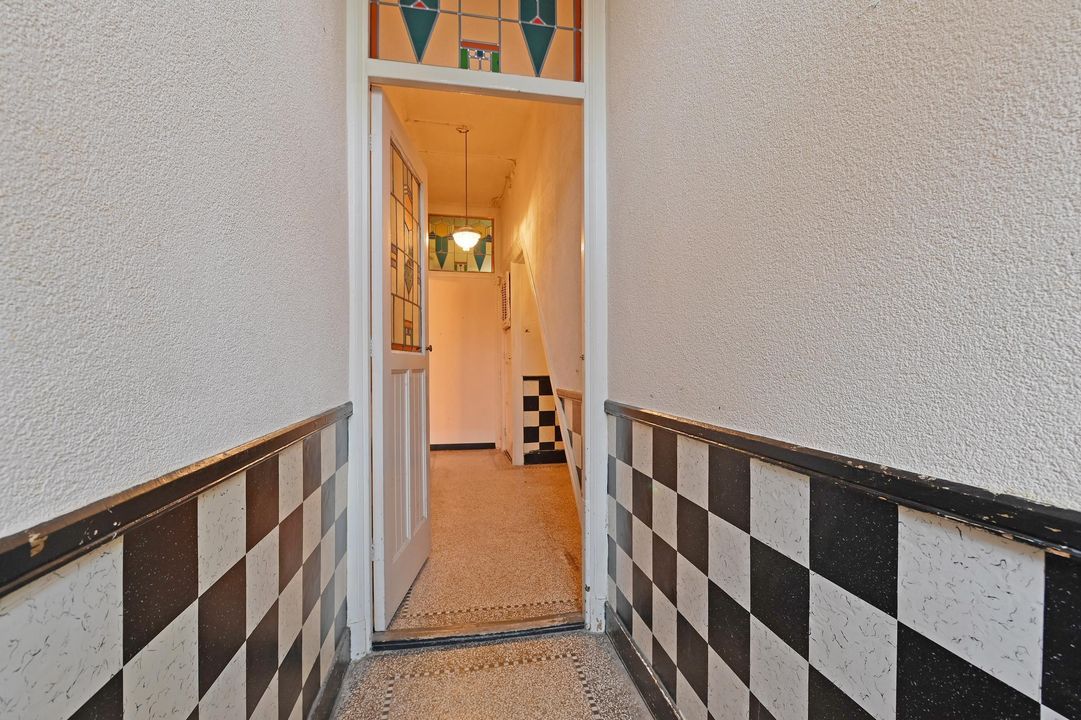 De indeling is als volgt: voortuin, vestibule met granietenvloer, tochtdeur met glas-in-lood bovenraam, gang met granito vloer en ruimte onder de trap voor fietsen en/of kinderwagen en groepenkast (4 groepen en aardlekschakelaar) en raampje v.v. glas-in-lood met doorkijk naar de woonkamer.