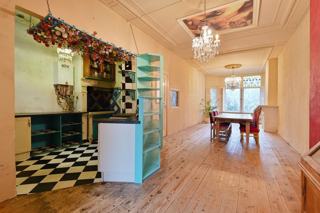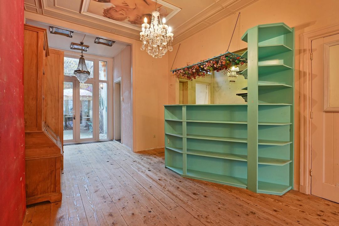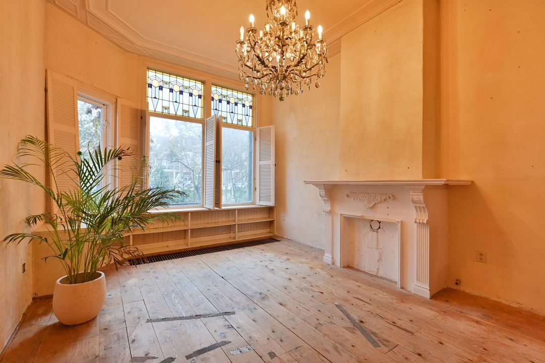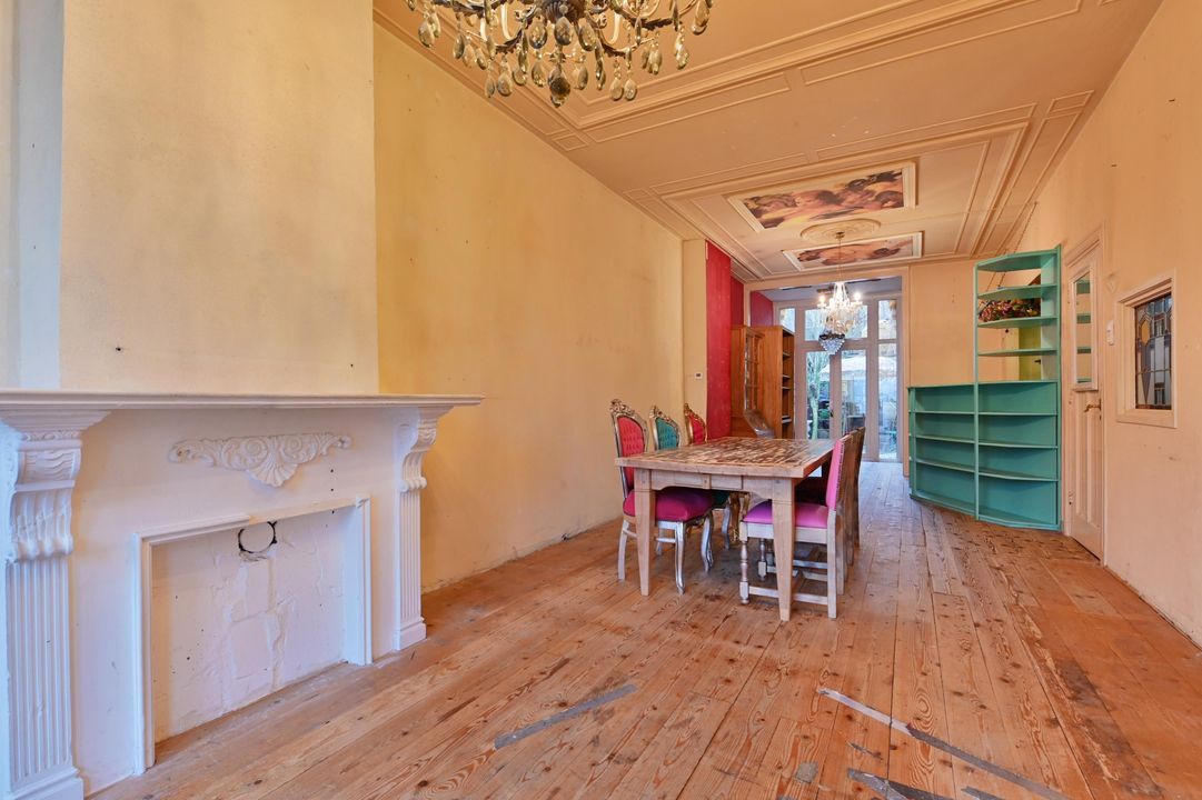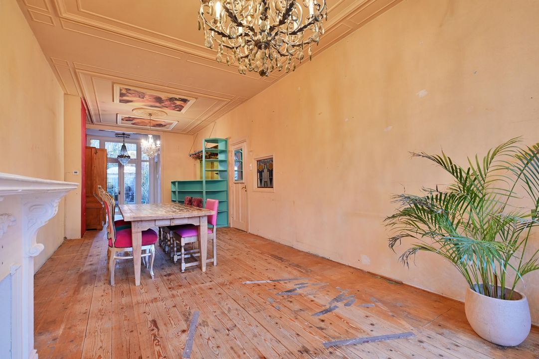 De zeer ruime woonkamer heeft nog de originele stucplafonds met sierlijsten, een schouw en grenen vloer. Aan de voorzijde houten kozijnen met dubbel glas en glas-in-lood bovenramen en leuk uitzicht over het pleintje. Aan de achterzijde een serre v.v. kunststof kozijnen (2024) met openslaande deuren naar de tuin en een nieuwe markies (2024).