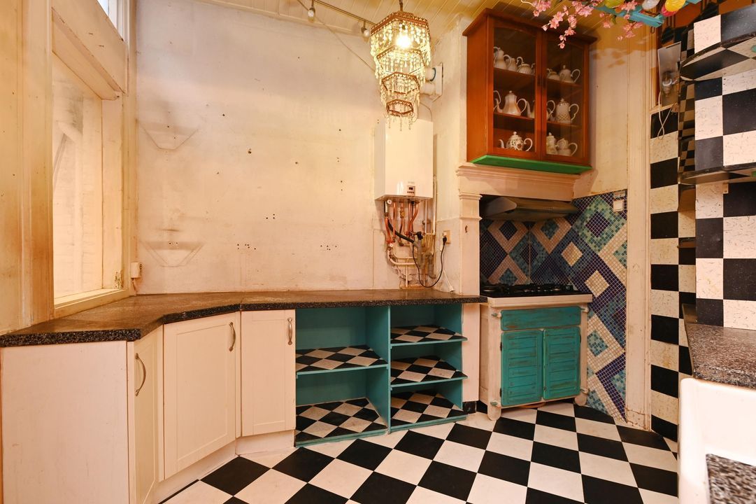 De semi-open keuken met eenvoudige keukenopstelling aan weerszijde van de ruimte is voorzien van een gaskookplaat, afzuigkap, losse afwasmachine, diverse opbergkastjes en lades en CV ketel Remeha Avanta, bouwjaar 2021.