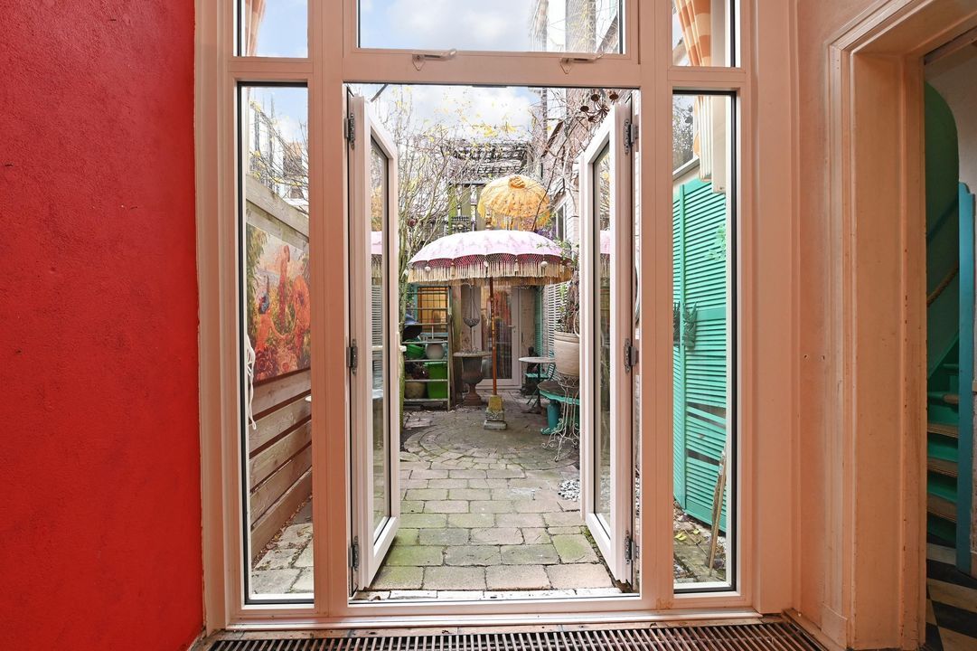 Doorloop naar de achterslaapkamer v.v. houten kozijnen met enkel glas en openslaande deuren naar de tuin, veel bergruimte en toegang tot een schuur/berghok.