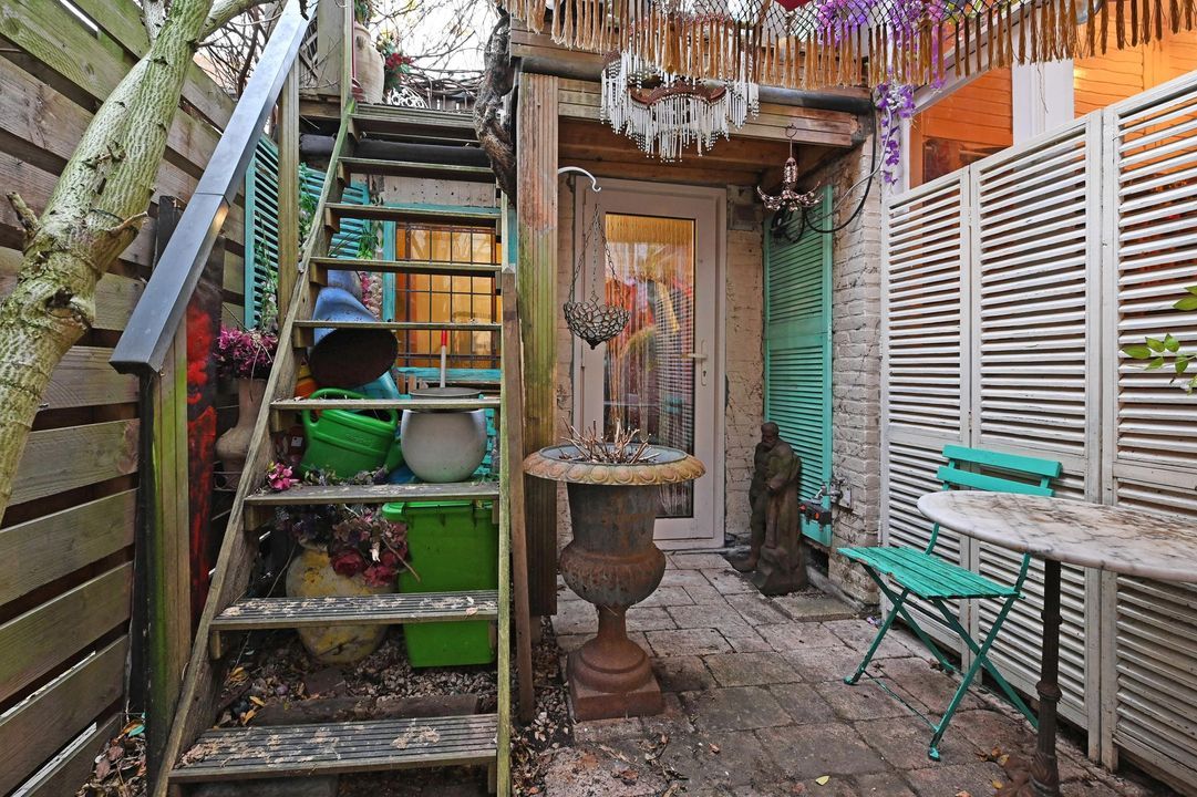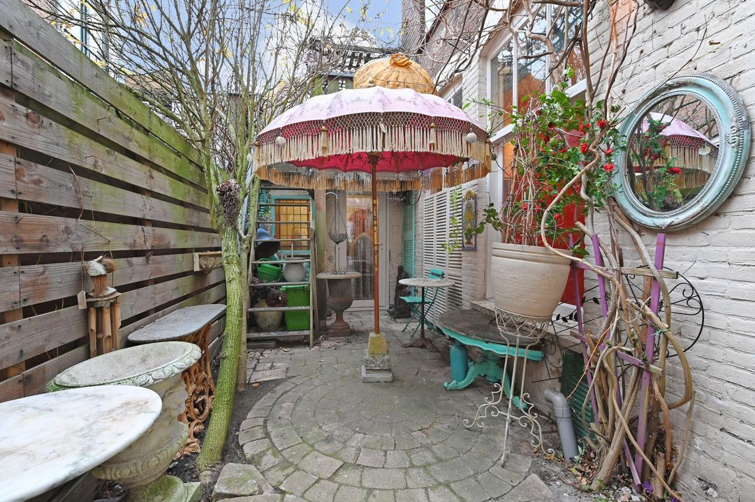 De tuin is op het zuidwesten gelegen en is v.v. tegels en een trap naar een terras op de 1e verdieping.