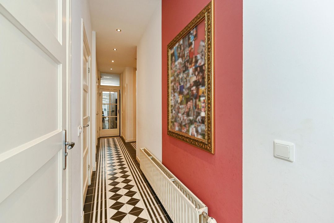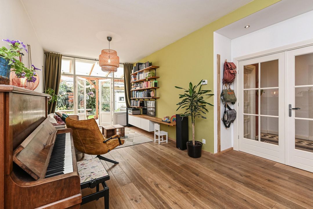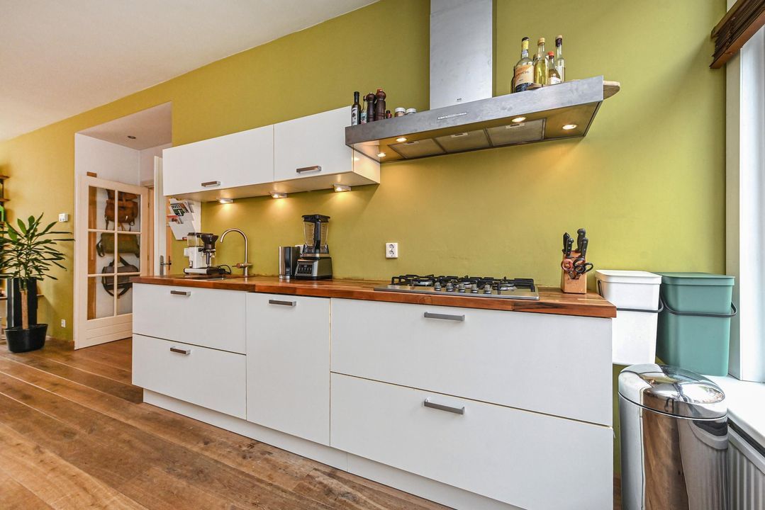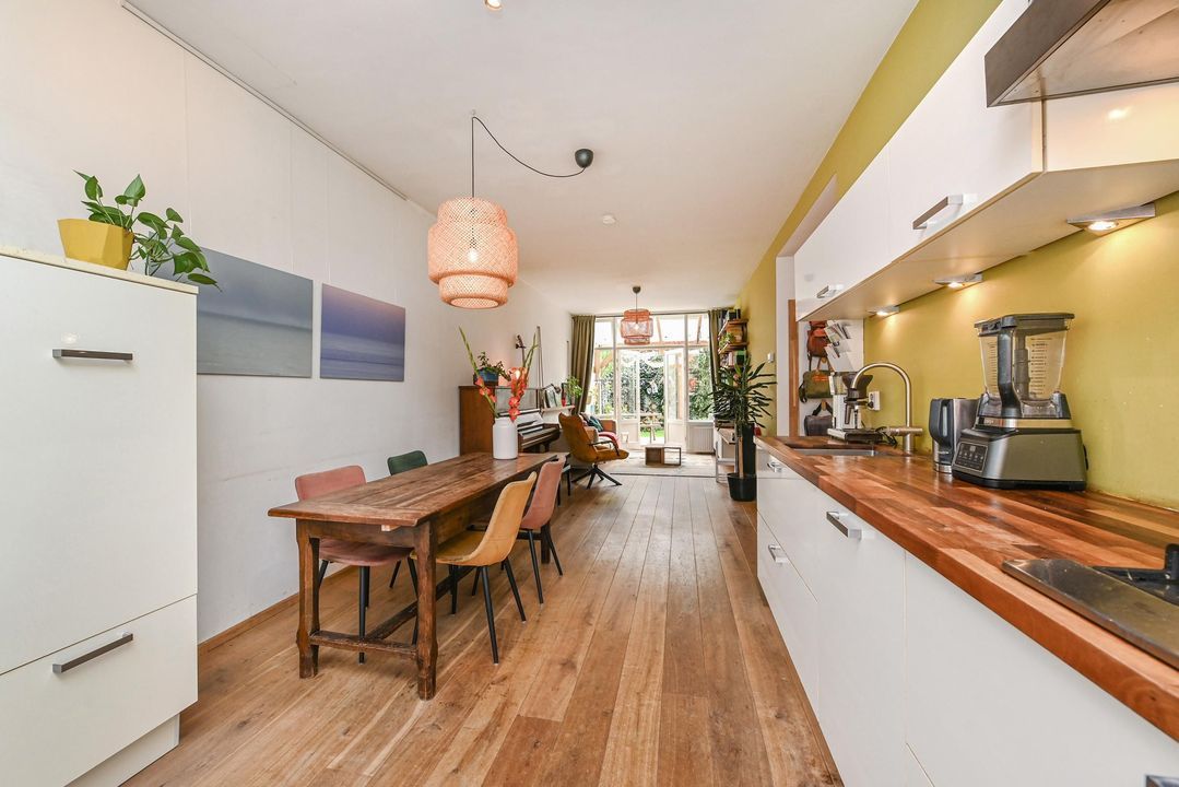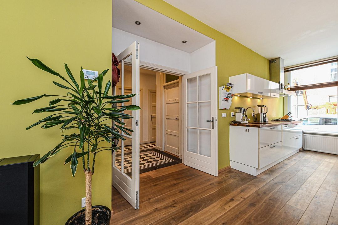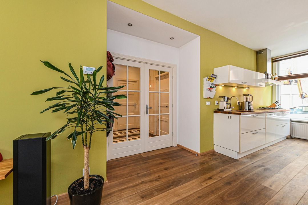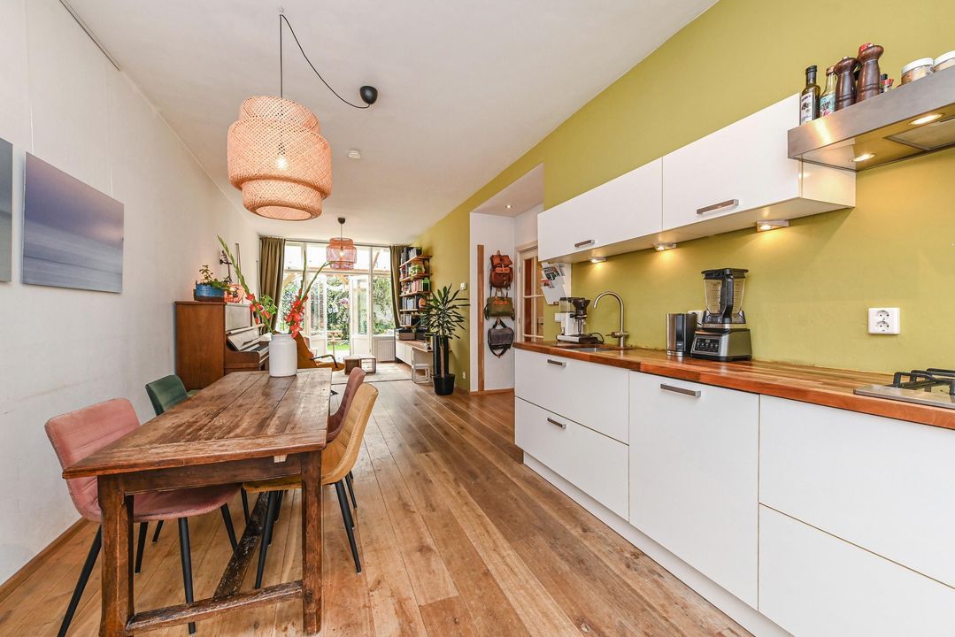 De gang loopt door naar een hal met “French doors” naar de gezellige woon-eetkamer. Deze royale lichte en doorgebroken woon-eetkamer heeft hoge strak gestuukte plafonds, eiken parketvloer, fraaie houten stolpdeuren met isolerende beglazing naar de achtertuin en aan de voorzijde de opengewerkte voorzijkamer alwaar de moderne keuken met aan 2 zijden een kasteblok met werkruimte, 5 pit gaskookplaat, RVS schouw, elektrische oven, koelkast en vaatwasser.