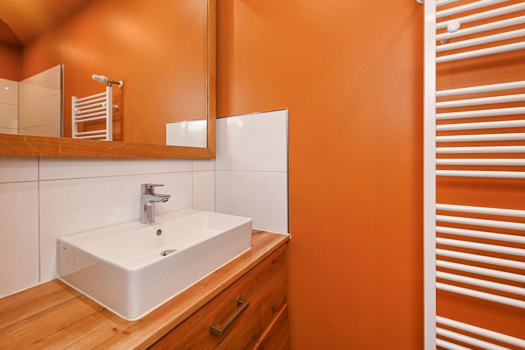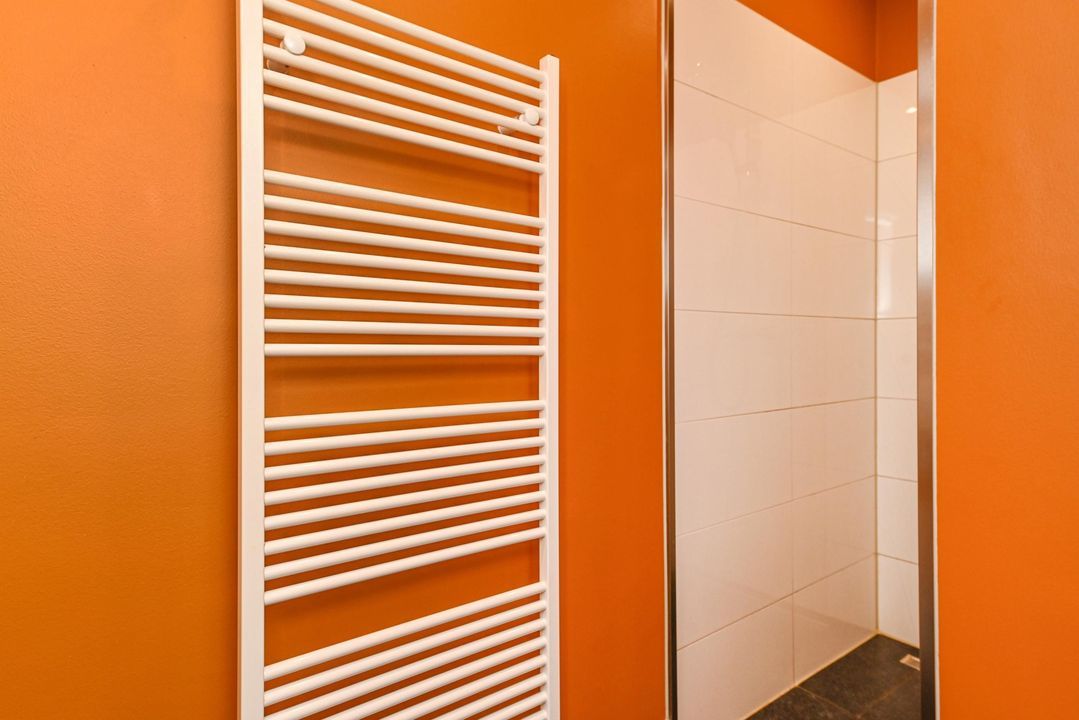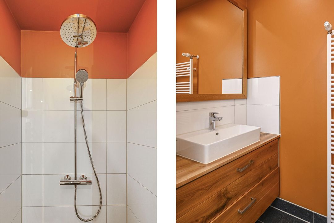 De moderne badkamer is uitgevoerd met een inloopdouche en een wastafelmeubel.