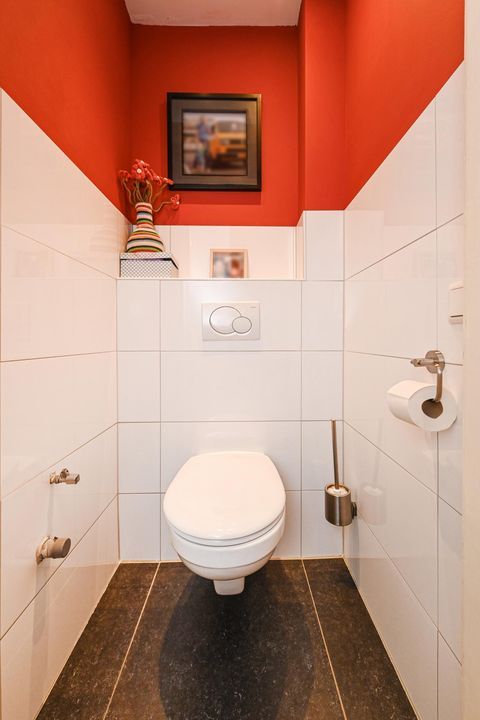 Entree, vestibule met tochtdeur naar de gang alwaar een meterkast onder de trap met moderne groepenkast (8 groepen en 2 aardlekschakelaars. Een vaste kast met opstelplaats voor de wasmachine en droger, en een modern toilet.
