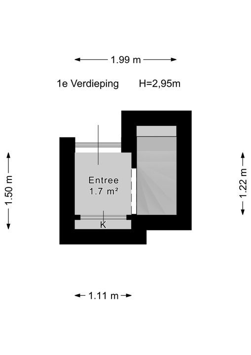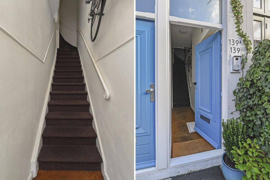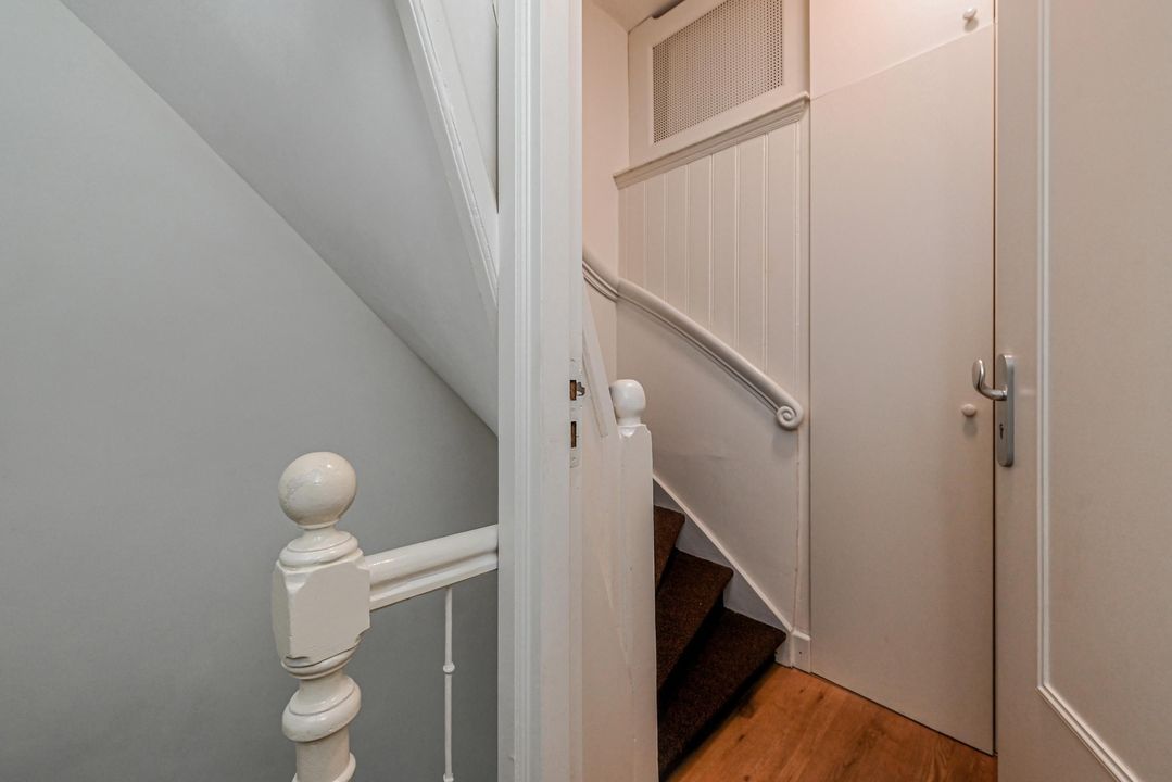 Tuinpad naar de voordeur met ruimte voor 2/3 fietsen. Entree op straatniveau, gang met meterkast, trap naar de 1e verdieping, entree appartement met garderobe, trap naar de 2e etage, overloop, toilet met fonteintje, via “French doors” toegang tot de ruime woonkamer.