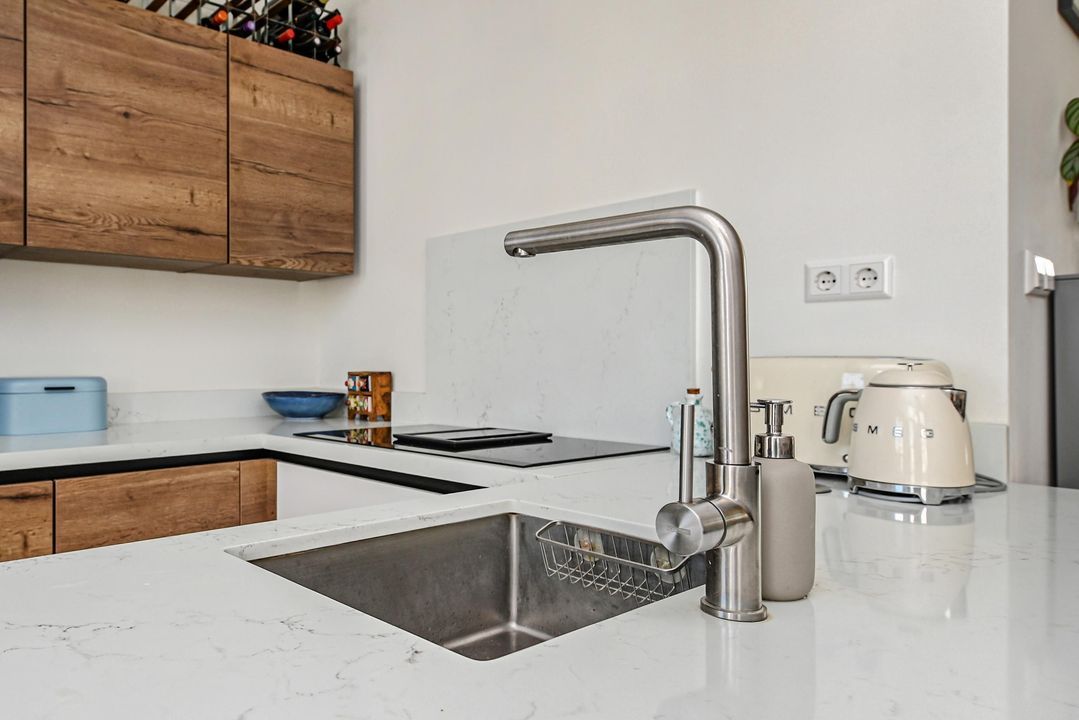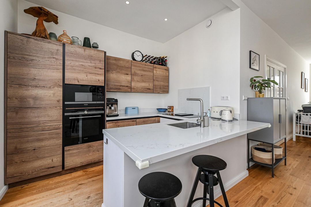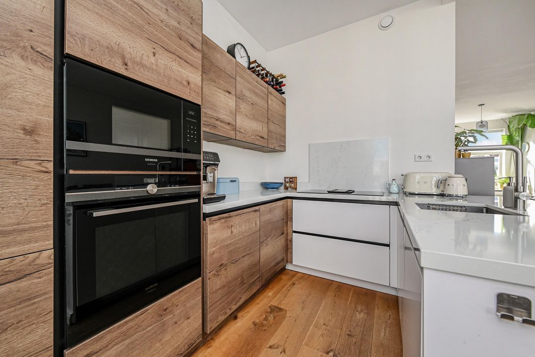 Door de ruimte, openheid en de grote raampartij aan zowel de voor- als achterzijde van de woning is er veel daglichttoetreding, met aan de achterzijde de luxe keuken in houtlook met een wit eiland voorzien van een marmerkleurige natuurstenen aanrechtblad, soft close kastruimte en voorzien van de volgende inbouwapparatuur van Siemens Studioline; vaatwasser, inductie kookplaat met geïntegreerd afzuigsysteem, afzuigkap ,geïntegreerd stopcontact, koel- en vriescombinatie, magnetron en een oven (bedienbaar via Wifi).