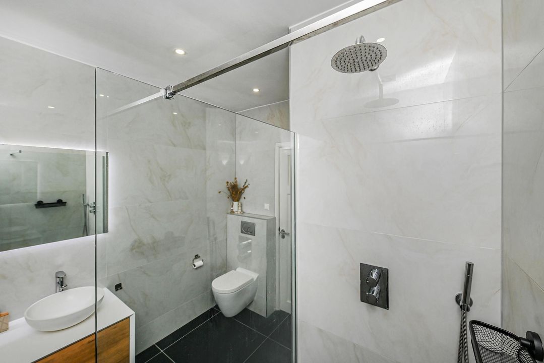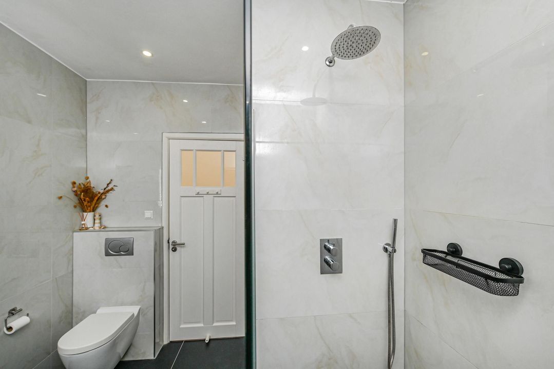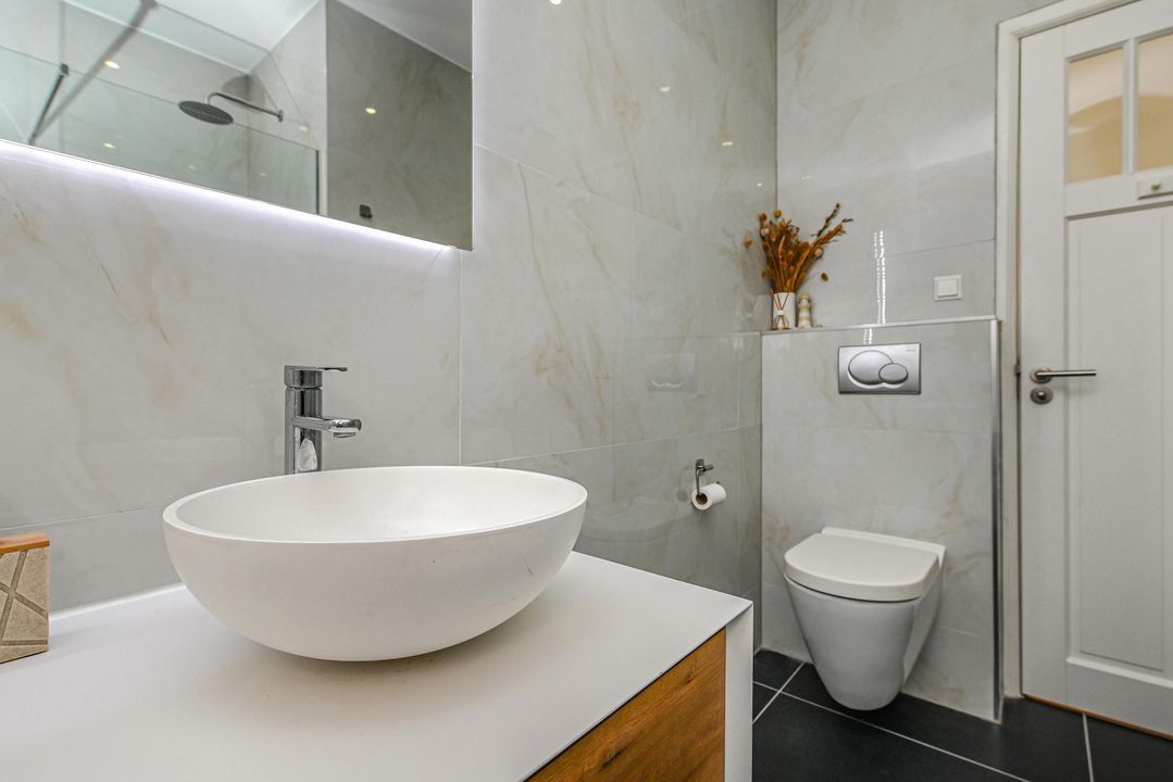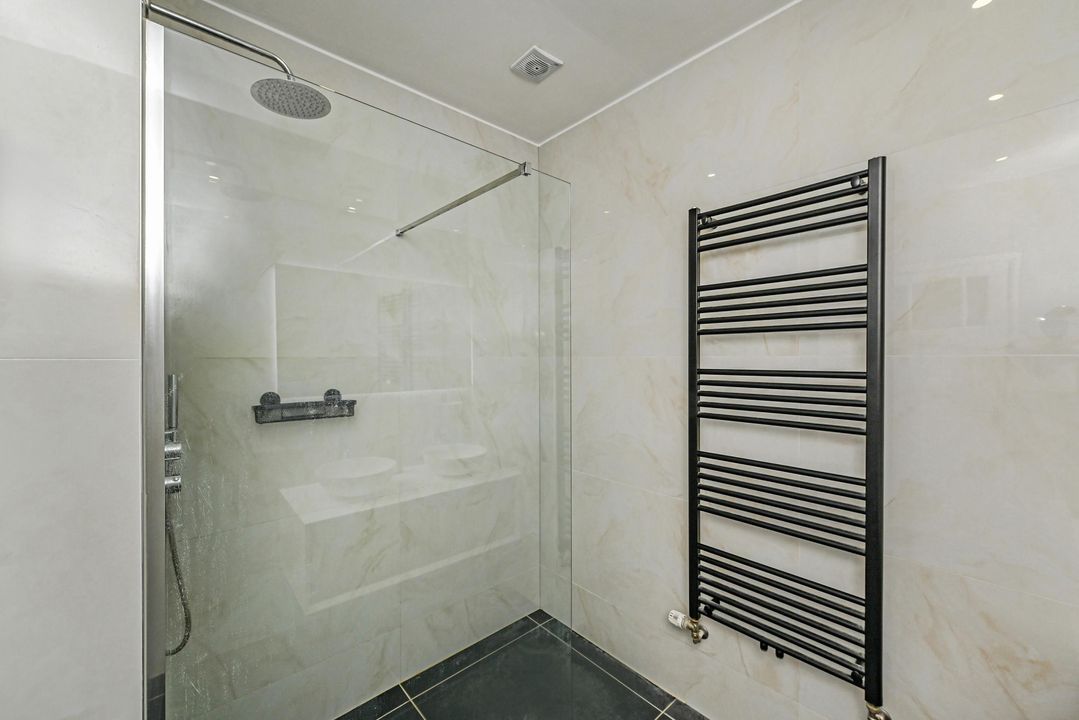De luxe badkamer treft u in het midden met marmerlook tegels en vloerverwarming, een inloop regendouche, houten badkamermeubel met twee waskommen van het duurzame en hygiënische materiaal Solid Surface, een verlichte spiegel en ook hier een zwevend toilet. Vaste kast met de CV combiketel, merk Remeha Avantie 2020, de wasmachine aansluiting en ruimte voor stofzuiger etc.