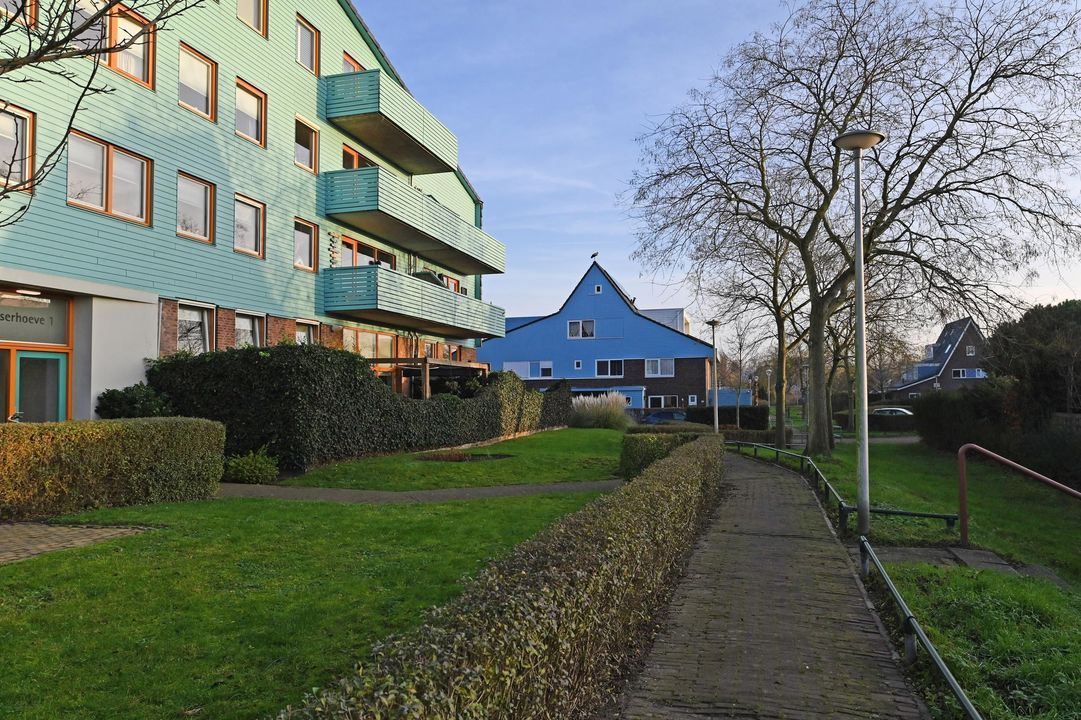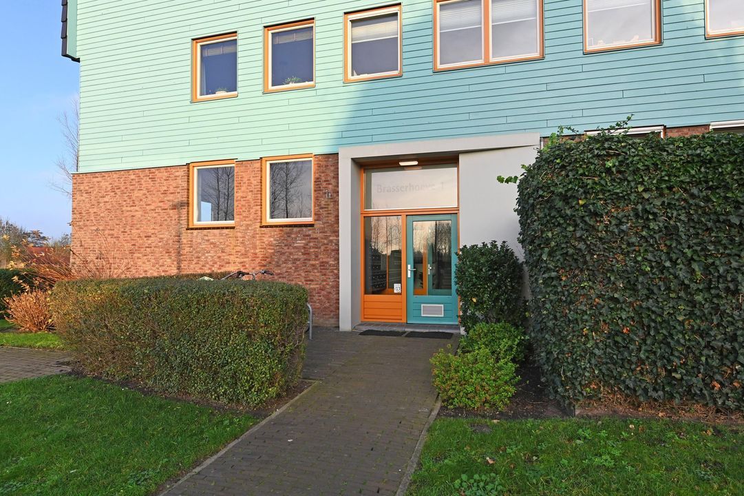 Het appartementencomplex Brasserhoeve I aan de landelijke Brasserskade heeft diverse ingangen, maar de hoofdentree met bel- en brievenbustableau en videofoon bevindt zich aan de voorzijde.