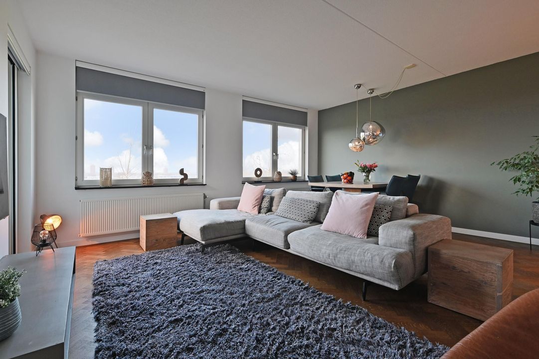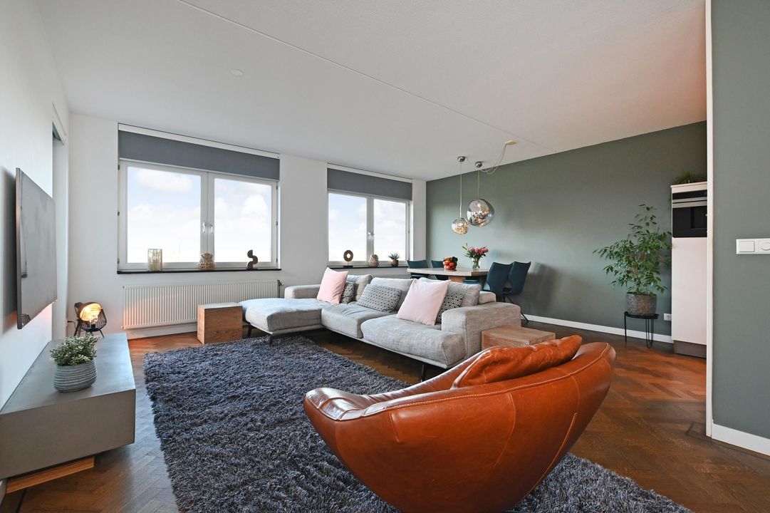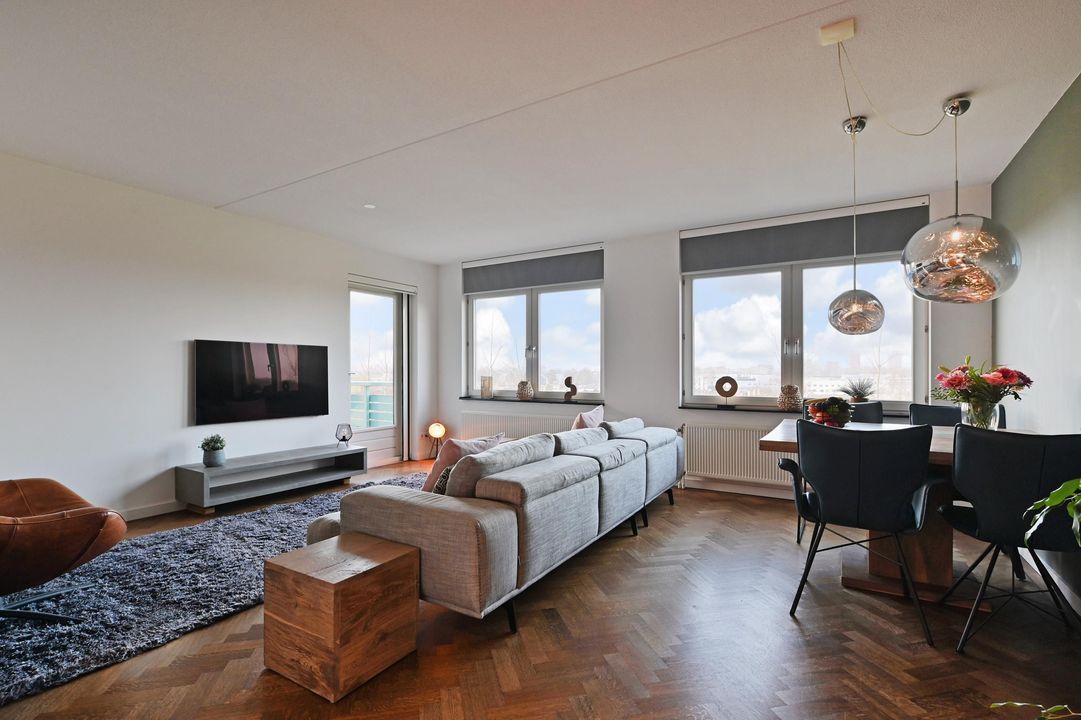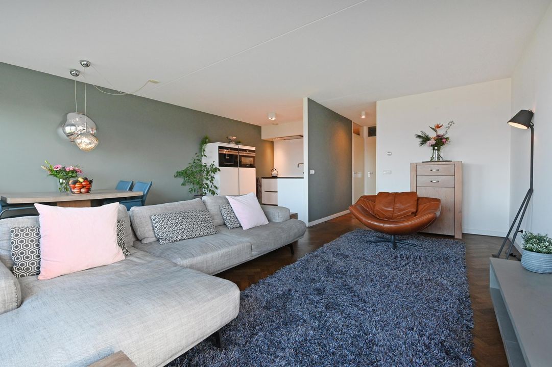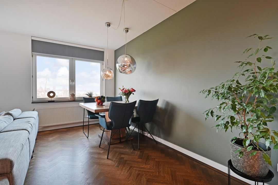 De royale en zeer lichte woon-/eetkamer biedt vrij uitzicht over de landerijen en een deel van Ypenburg. Door de relatief lage ligging op de 3e verdieping ervaart u nog contact met de grond en ziet u in het voorjaar als eerste de lammetjes huppelen aan de overzijde van het appartement.