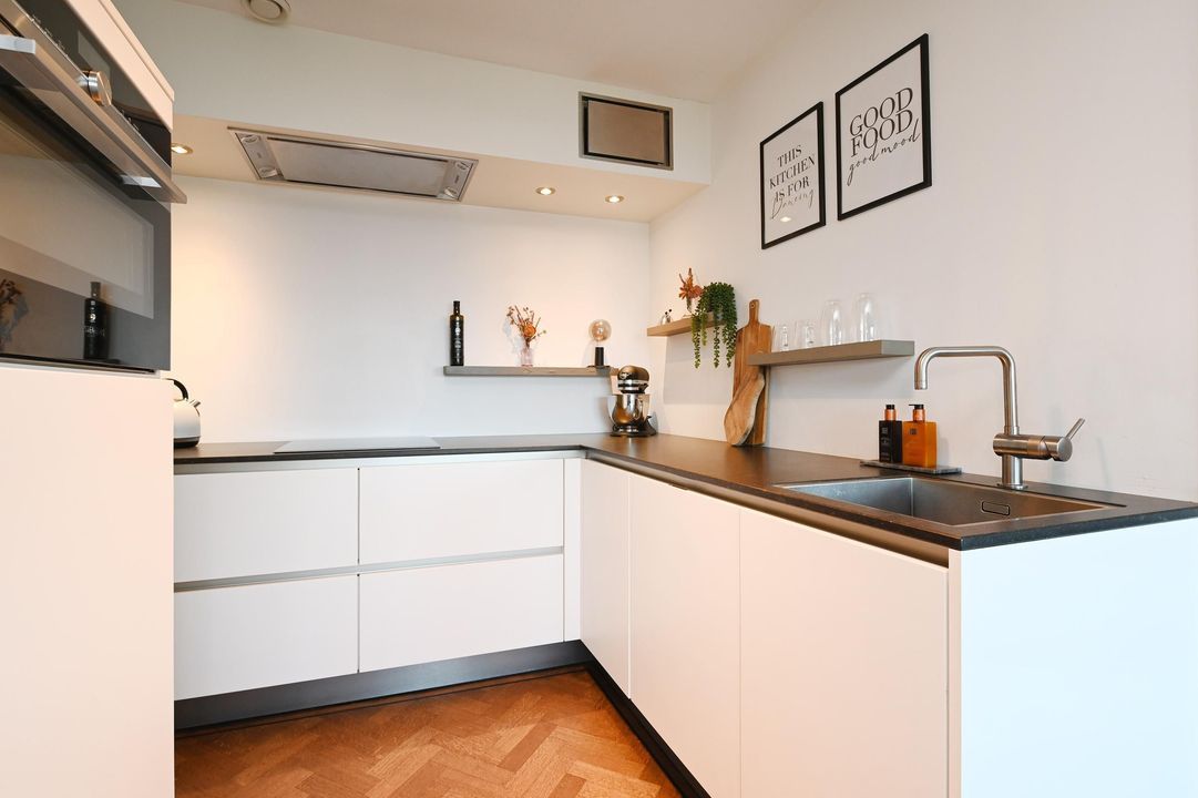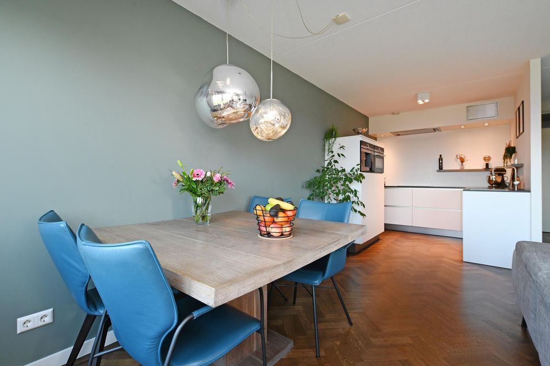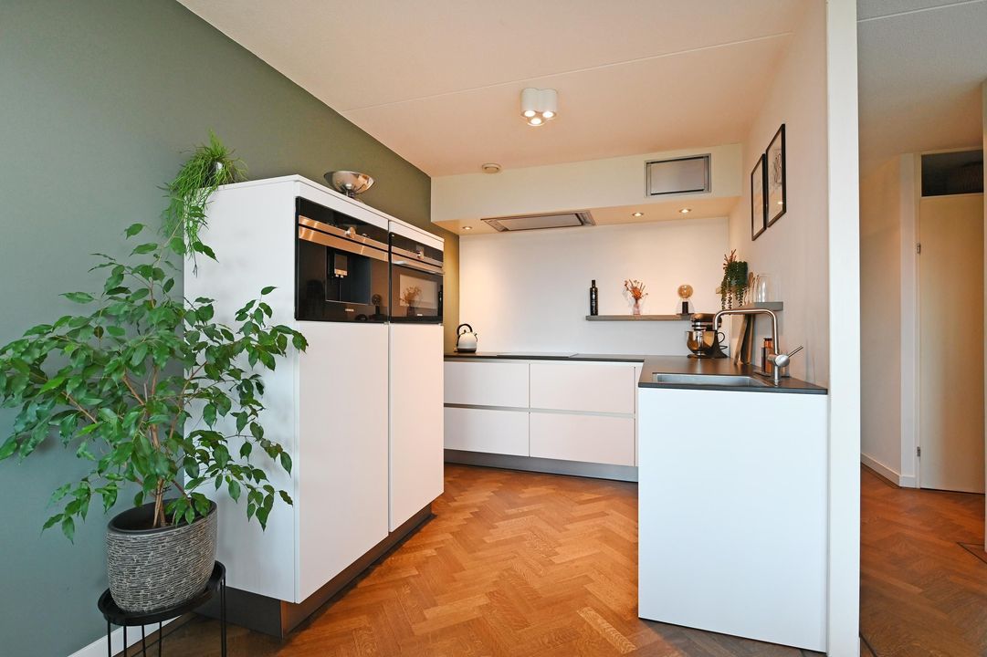 De sfeervolle maar lichte woon-/eetkamer is uitgevoerd met een fraaie eiken visgraatparketvloer en biedt toegang tot het ruime zonnige terras, evenals tot de luxe open keuken. De keuken is in een U-opstelling geplaatst en voorzien van diverse inbouwapparatuur, waaronder een inductiekookplaat, een in een koof geplaatst afzuigsysteem, combi-oven, koelkast, vriezer, vaatwasser en koffiemachine.