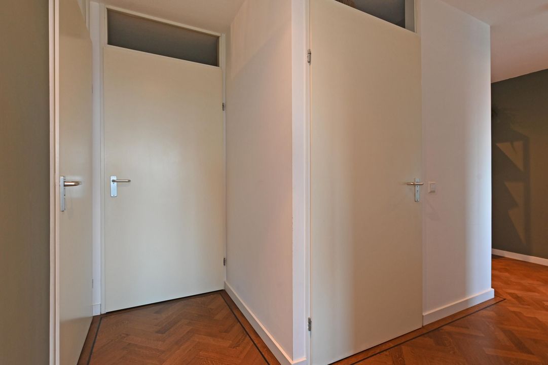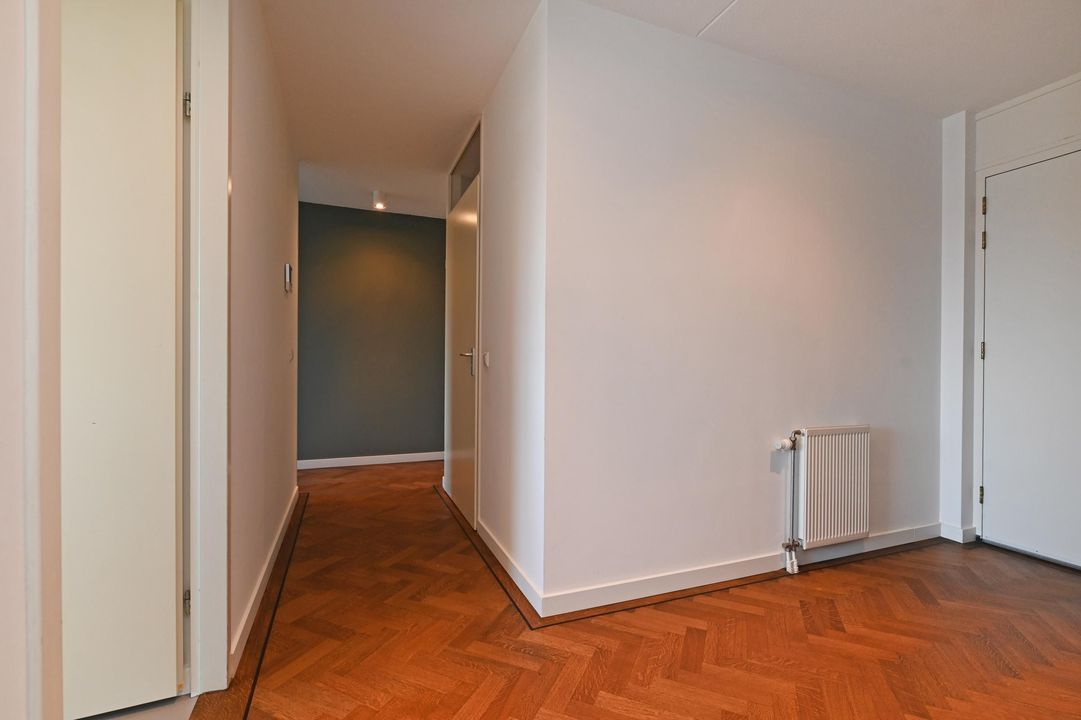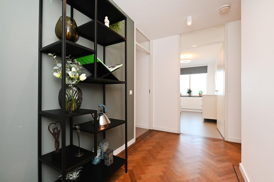 Indeling: Centrale hal met lift, trappenhuis en AED. Entree van de woning op de 3e verdieping: een ruime, lichte gang met een fraaie eiken visgraatparketvloer met ingelegde bies, welke in een groot deel van de woning is doorgelegd. De gang geeft toegang tot alle vertrekken, waaronder een luxe toiletruimte met wandcloset en fonteintje, en een inpandige berging met opstelplaats voor wasmachine en droger.