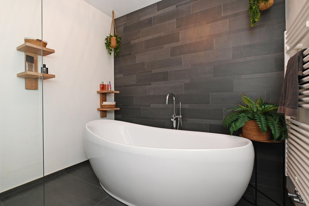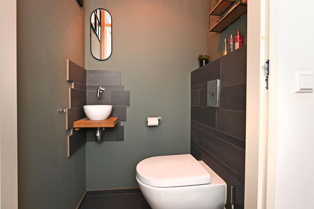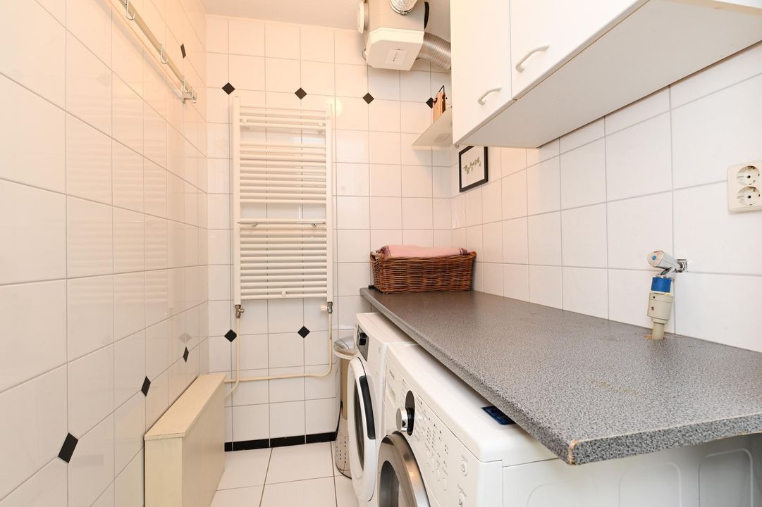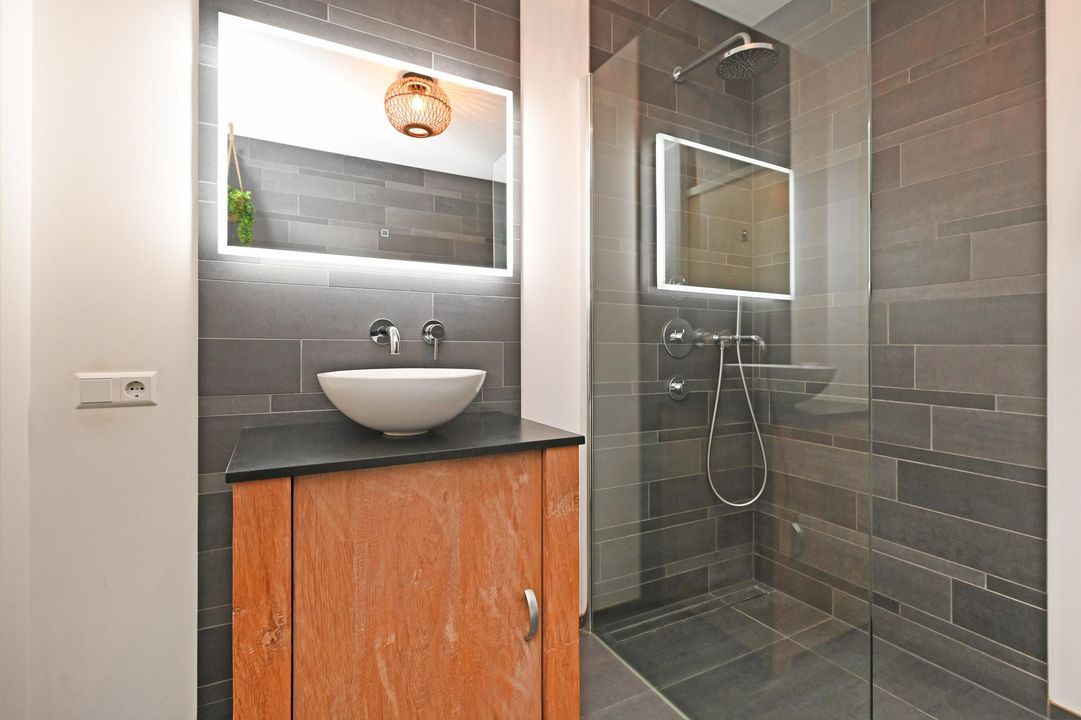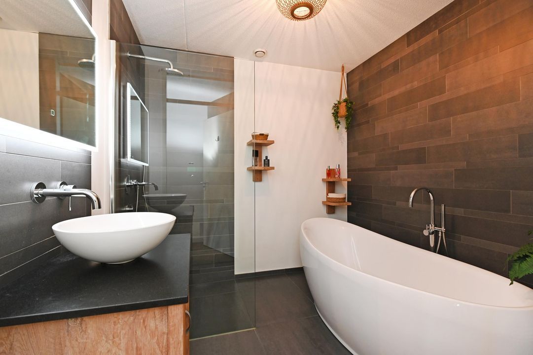 De luxe badkamer is ruim van opzet en voorzien van een inloopdouche, losstaand ligbad, wastafelmeubel en handdoekradiator. De gehele woning is zeer licht, ruim bemeten en kwalitatief hoogwaardig afgewerkt.
