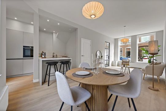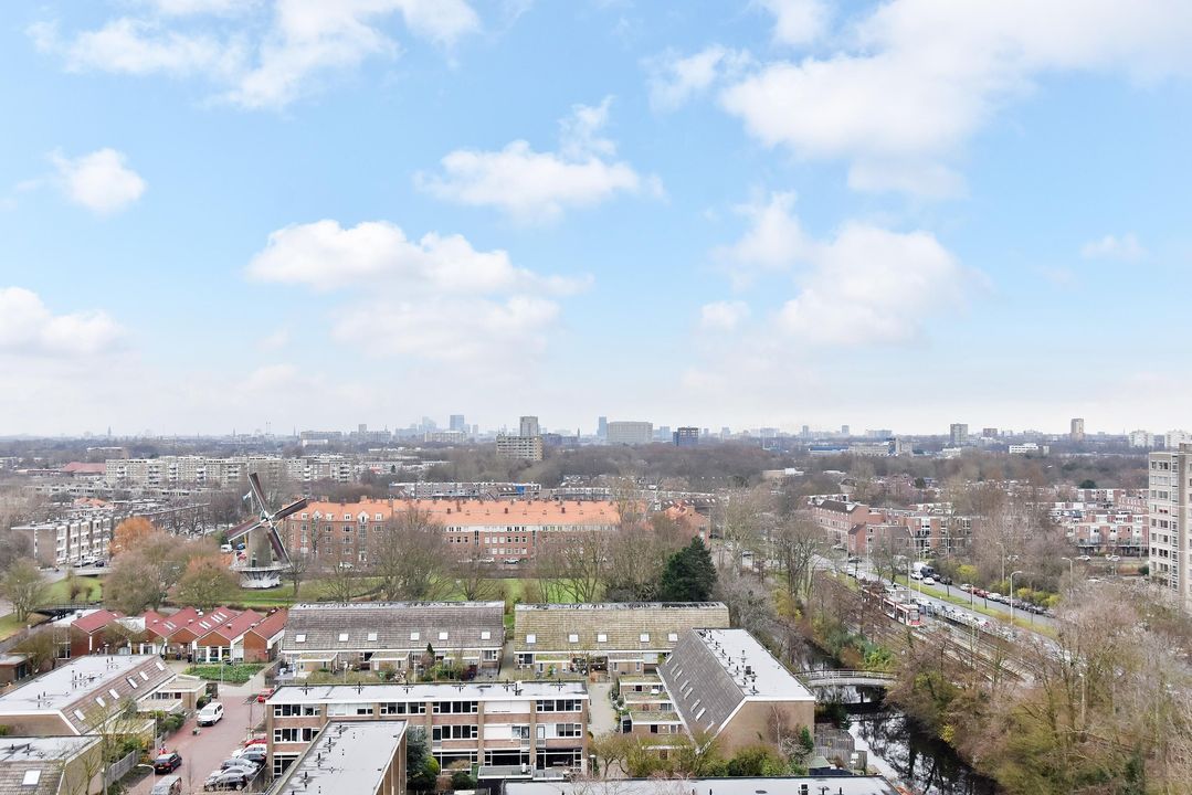 Vanuit de woon-eetkamer is er doorloop naar de keuken. Ook vanaf deze kant van de woning is er genoeg te zien, en kijkt u via de grote raampartij over de skyline van Den Haag. Over de volle breedte van de voorzijde vindt u een balkon dat u vanuit de keuken kunt betreden. De keuken is voorzien van onder- en bovenkasten in witte kleurstelling en een aanrechtblad van beton ciré. De keuken is voorzien van diverse apparatuur zoals een koelkast met vriesvak, oven, 5-pits gasfornuis en vaatwasser. Ook de wasmachine is netjes weggewerkt in één van de keukenkasten.