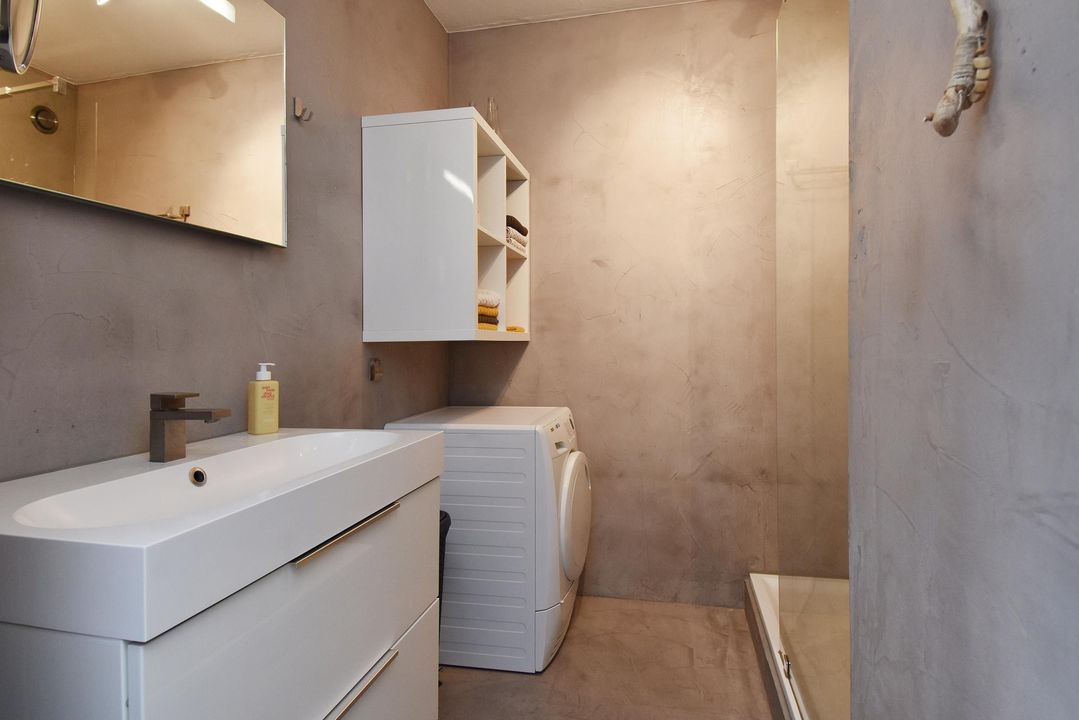 De moderne badkamer is afgewerkt met betonciré en voorzien van een zeer ruime inloopdouche met douchescherm, een brede wastafel met wastafelmeubel en de opstelplaats voor de droger.