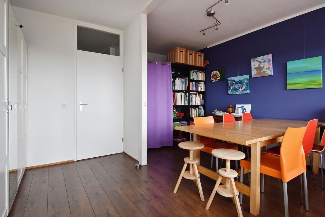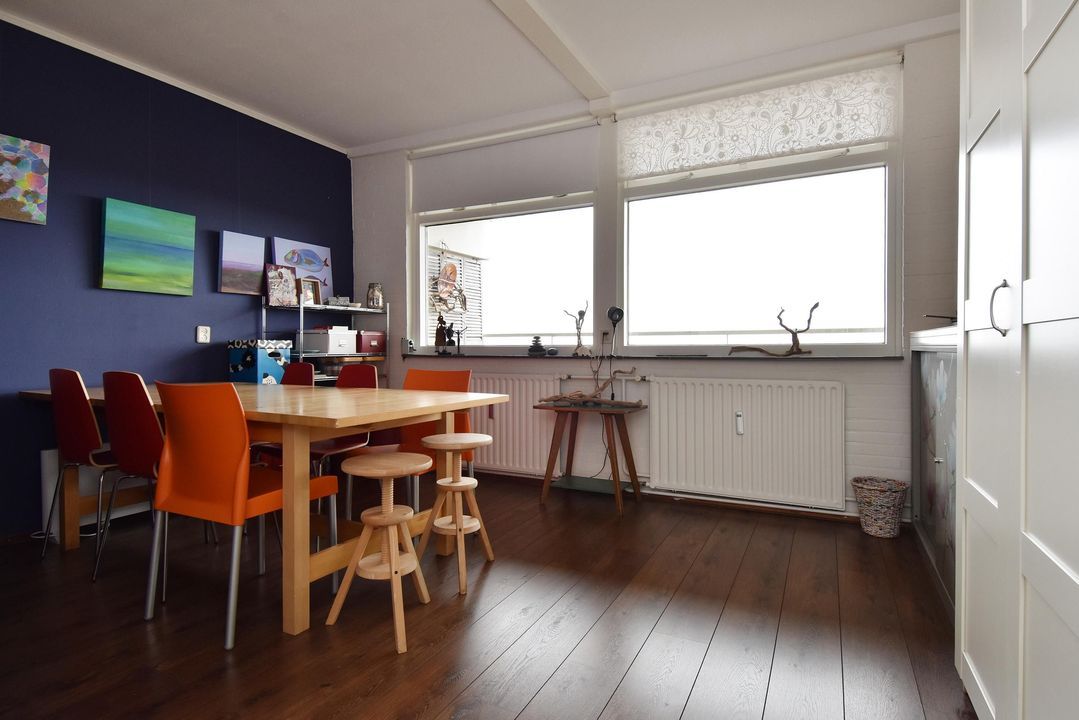 U komt binnen in de royale, zonnige woon-eetkamer. Deze gehele woning is voorzien van een laminaatvloer in warme, donkere kleurstelling. De zitkamer is aan de achterzijde van de woning gesitueerd. Vanaf de bank heeft u prachtig uitzicht en toegang tot het balkon/terras met panoramisch uitzicht richting de kustlijn en tot voorbij Hoek van Holland.