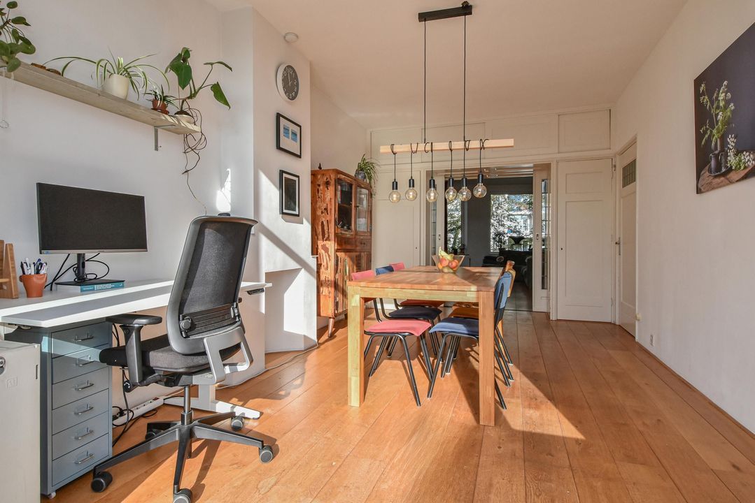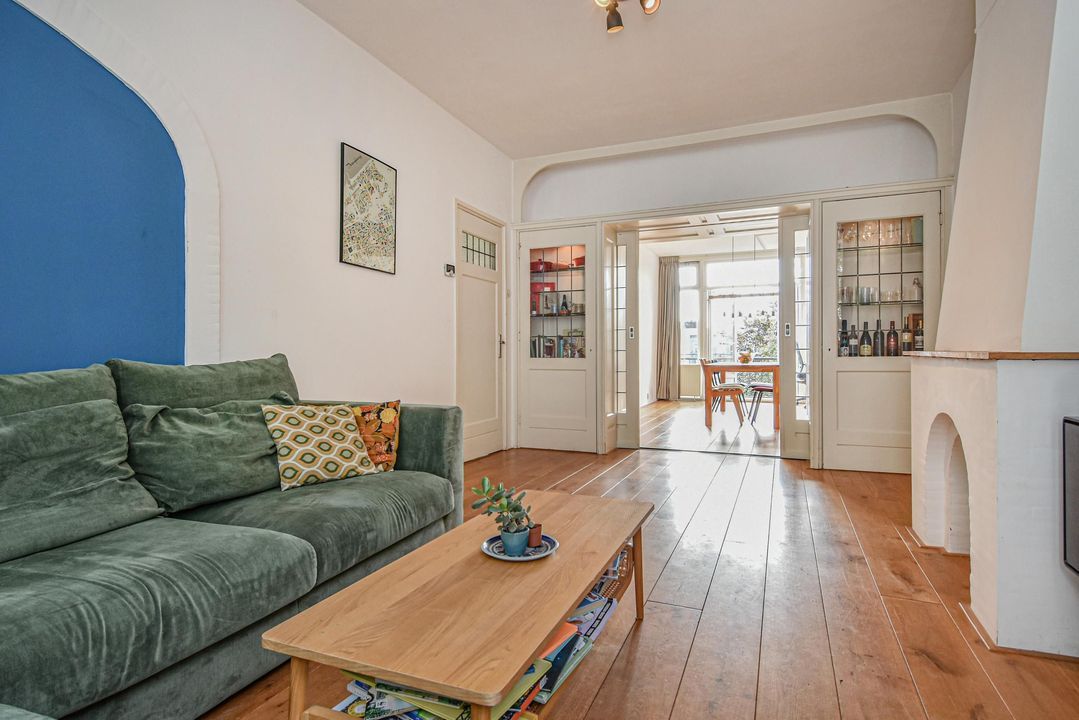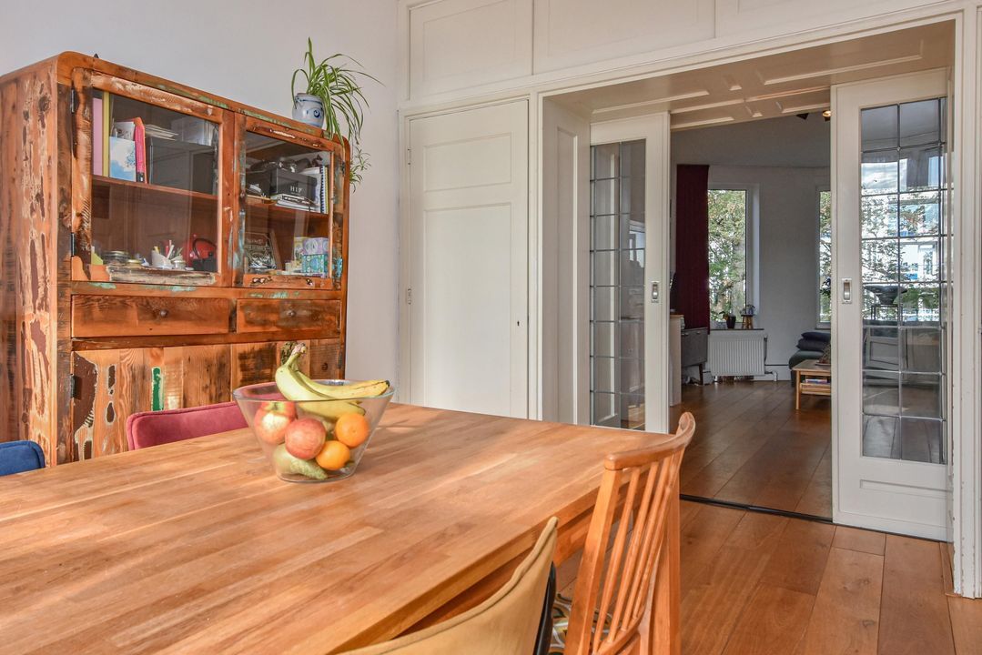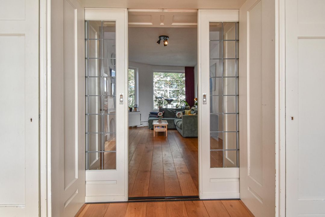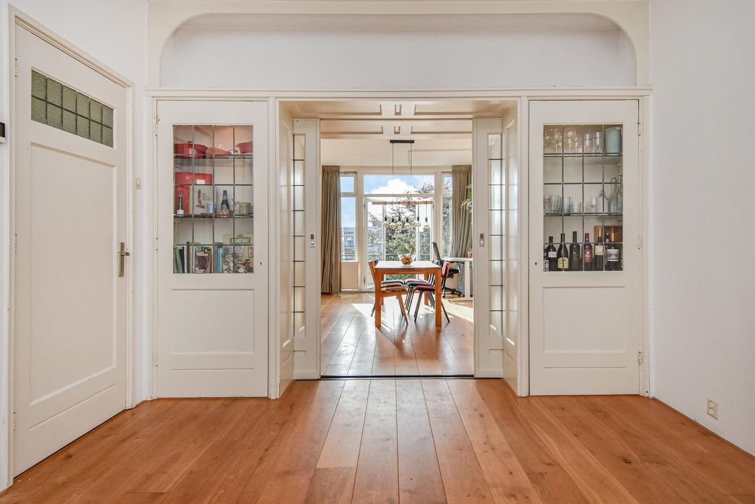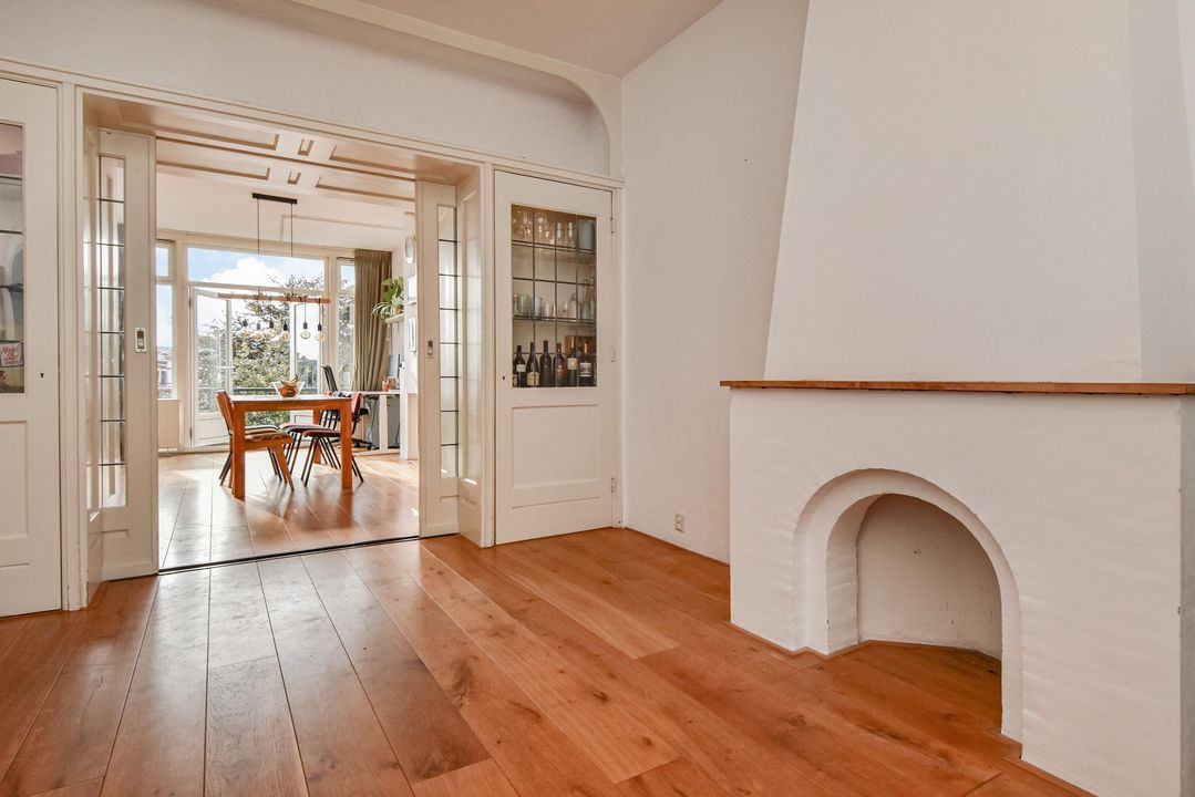 Gezellige, zeer ruime woonkamer ensuite met een voorkamer v.v. eiken vloer, open haard en vrij zicht over de Hanenburglaan, suite separatie naar de achterkamer met schuifdeuren v.v. glas-in-loodramen, vaste kasten en ook in de achterkamer eiken vloeren, vaste kasten en openslaande deuren naar het zonnige achterbalkon gelegen over de volle breedte van de woning en v.v. zonwering en balkonberging.