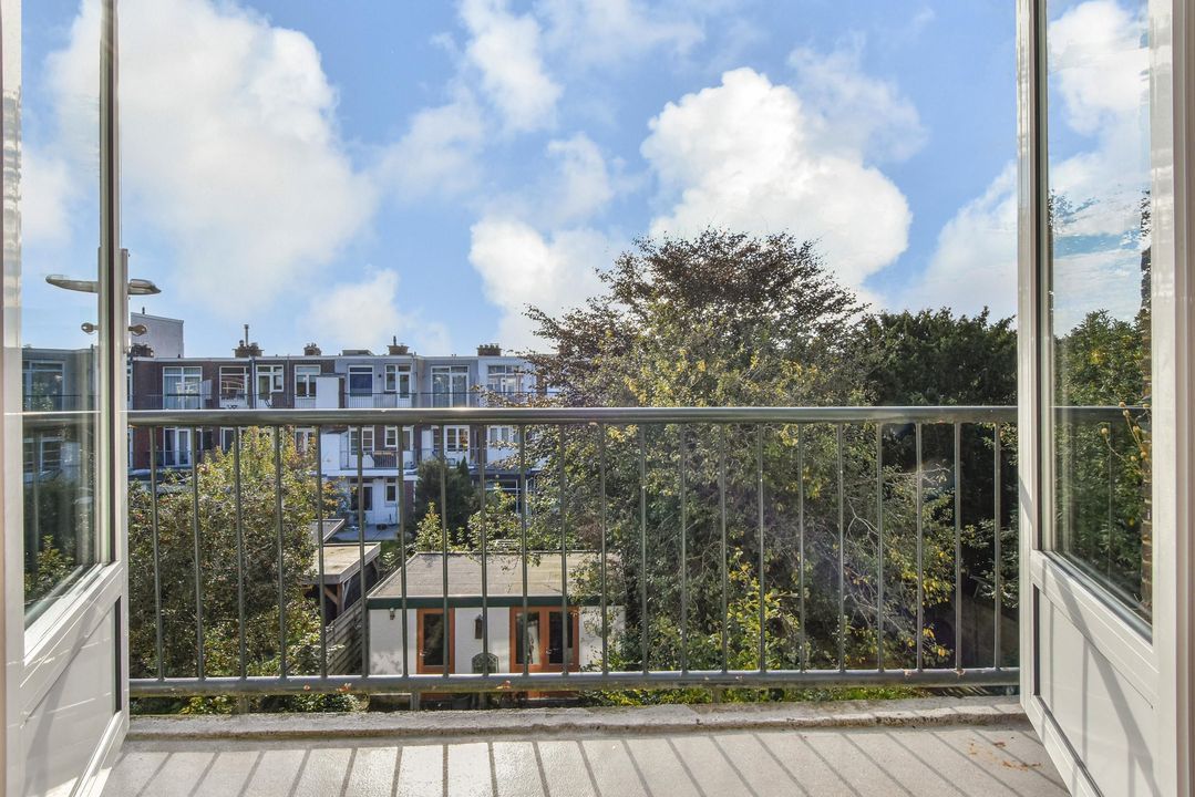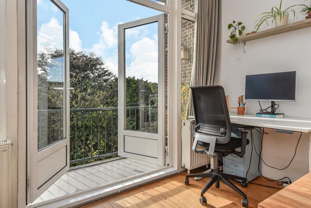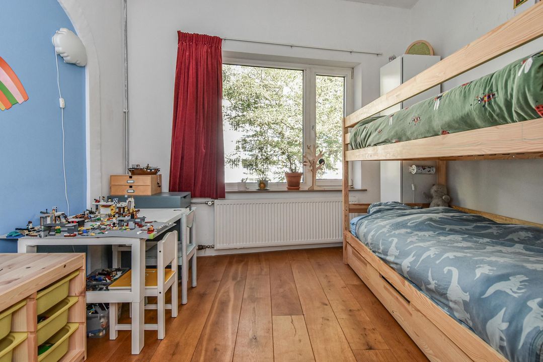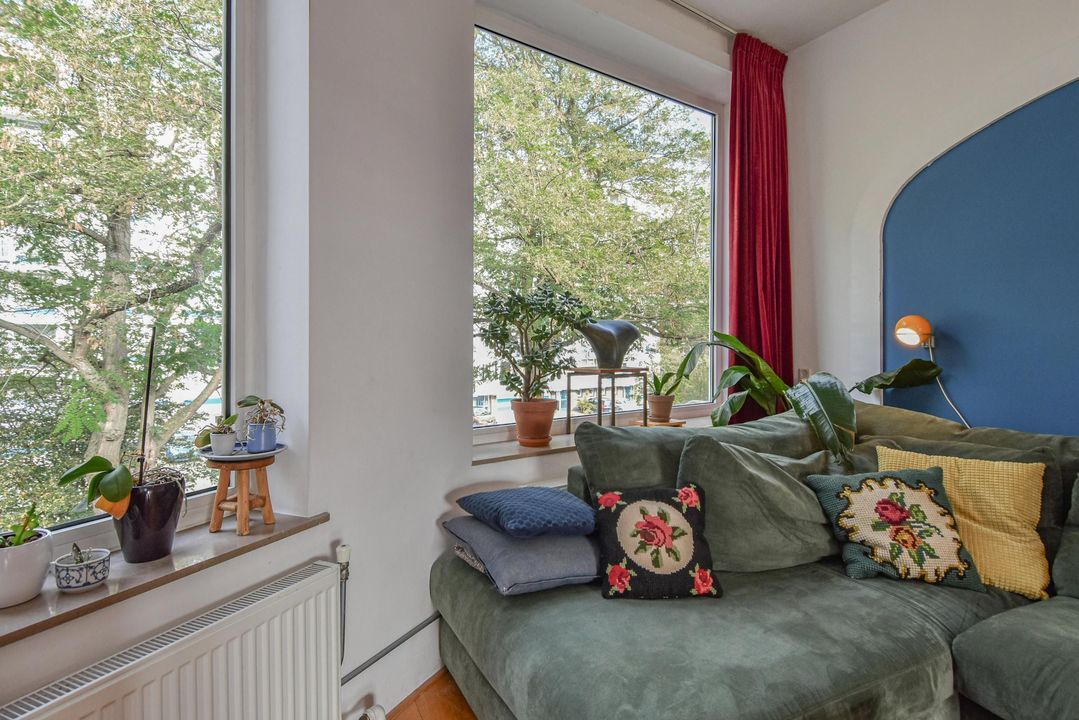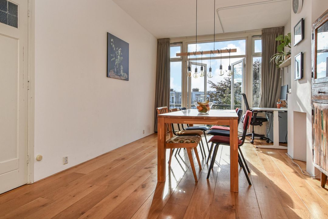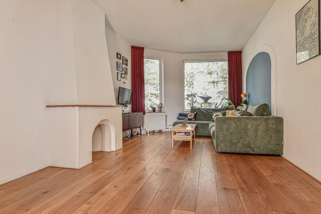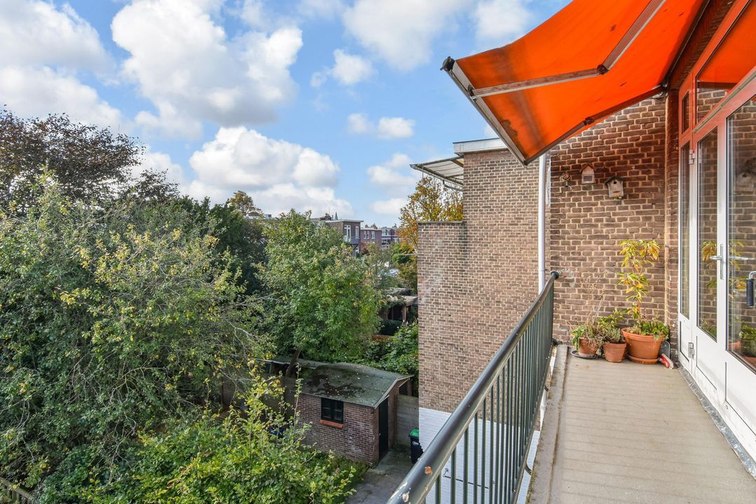 Gezellige, zeer ruime woonkamer ensuite met een voorkamer v.v. eiken vloer, open haard en vrij zicht over de Hanenburglaan, suite separatie naar de achterkamer met schuifdeuren v.v. glas-in-loodramen, vaste kasten en ook in de achterkamer eiken vloeren, vaste kasten en openslaande deuren naar het zonnige achterbalkon gelegen over de volle breedte van de woning en v.v. zonwering en balkonberging.