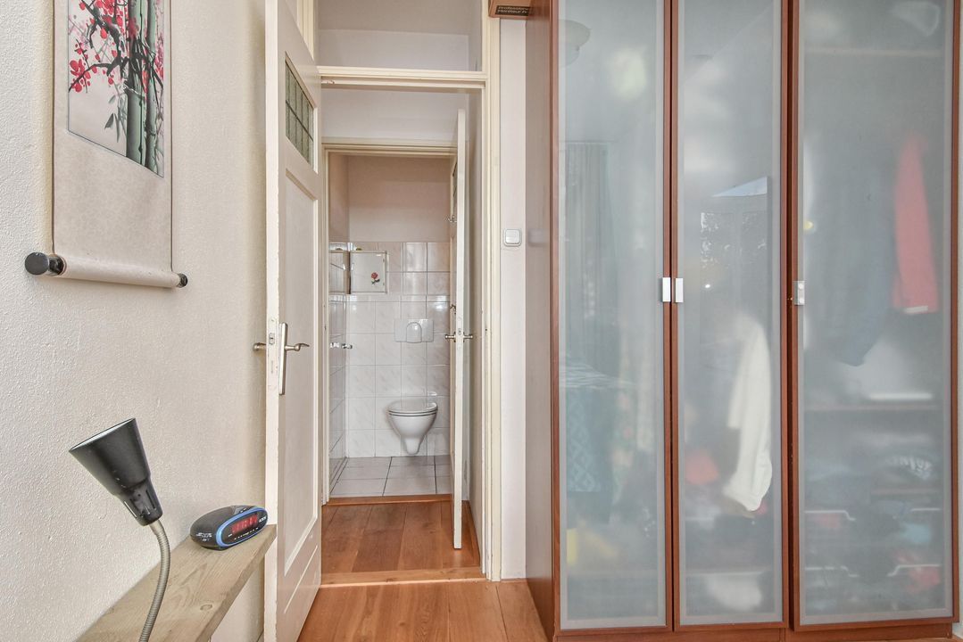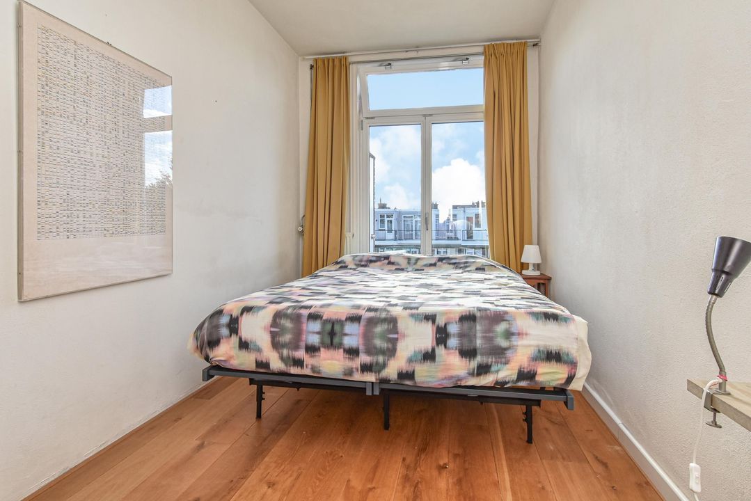 Ruime lichte voorslaapkamer met eiken parketvloer, een vaste kast en kunststof kozijnen met isolerende dubbele beglazing. De achterslaapkamer is ook uitgevoerd met eiken vloeren, kunststof kozijnen met isolerende dubbele beglazing. Ook vanuit deze achterkamer toegang via openslaande deuren naar het zonnige balkon.