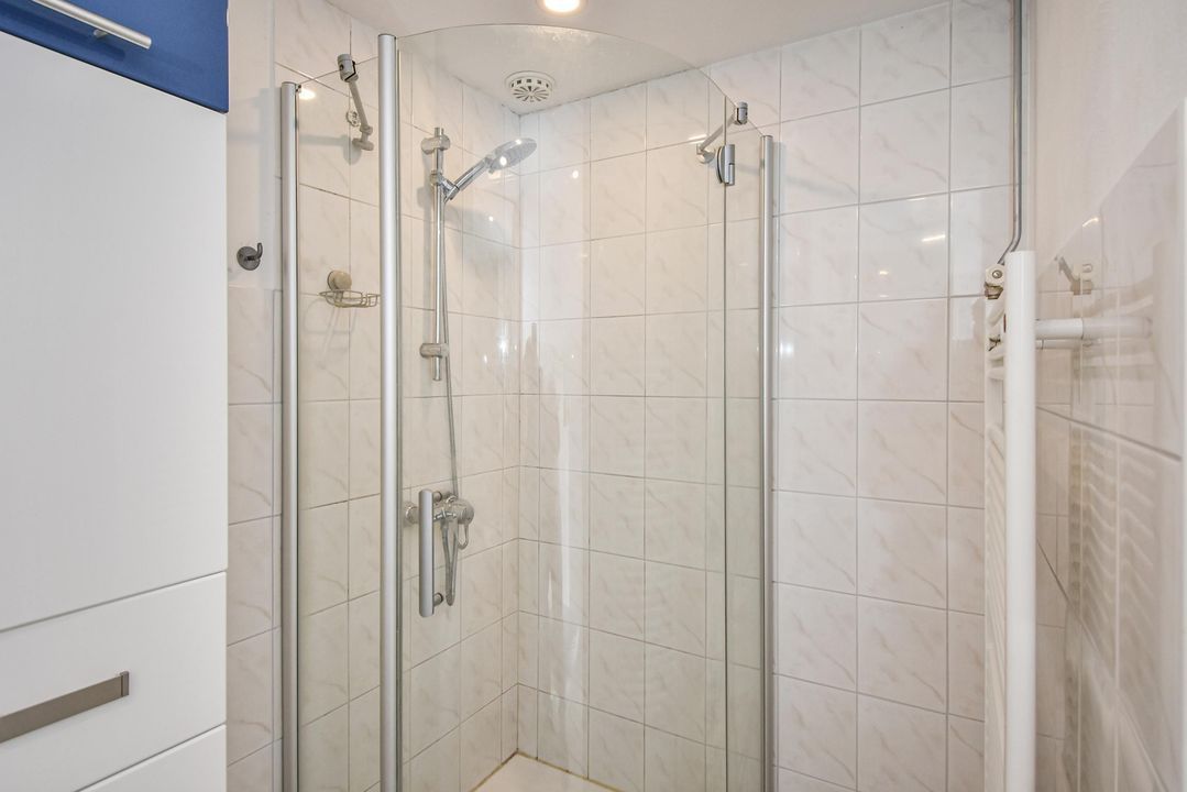 De ruime en moderne badkamer is uitgevoerd met een douchecabine, vaste wastafel, badkamermeubel, wandcloset en handdoekradiator.