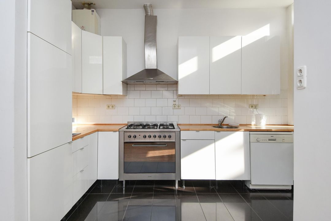 De moderne semi-open keuken is geplaatst in een L-opstelling en is uitgevoerd met een groot gasfornuis met brede oven, RVS afzuigkap, koelkast, vrieskast, vaatwasser en vloerverwarming. Ook vanuit de keuken is er doorloop naar de aangebouwde serre.
