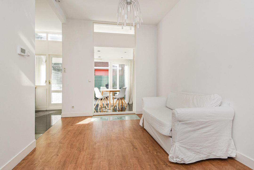 Via openslaande deuren komt u in de zeer lichte, L-vormige woon-eetkamer. De wooneetkamer is voorzien van convectoren in de vloer, geïsoleerde voorgevel, geïsoleerd plafond en van een laminaatvloer in warme kleurstelling. Aan de voorzijde zijn grote raampartijen met houten kozijnen en dubbel glas. Achter de woonkamer is een zeer goed geïsoleerde tuinkamer/serre gecreëerd. Hier liggen plavuizen met vloerverwarming en zijn grote openslaande deuren over de volle breedte van de achtergevel met toegang naar de tuin. Deze serre bied in de zomer met alle 4 de deuren open een overdekt terras zonder belemmering van kozijnstijlen en met de deuren gesloten een aangename lichte kamer. Ook de wasmachine aansluiting en cv-combiketel (Remeha Tzerra, 2011) zijn hier te vinden. De achtertuin is gelegen op het oosten en is voorzien van tegels en borders.