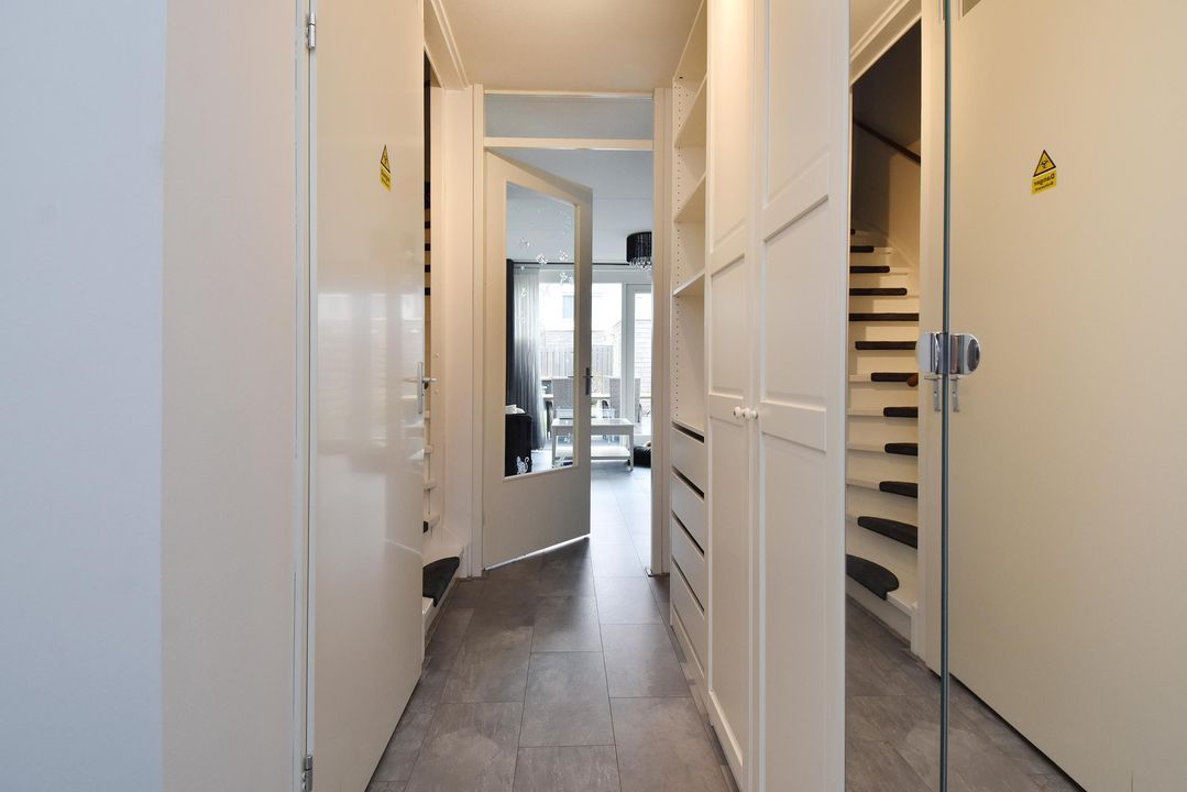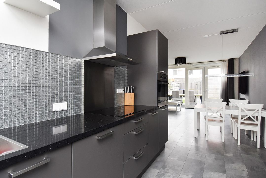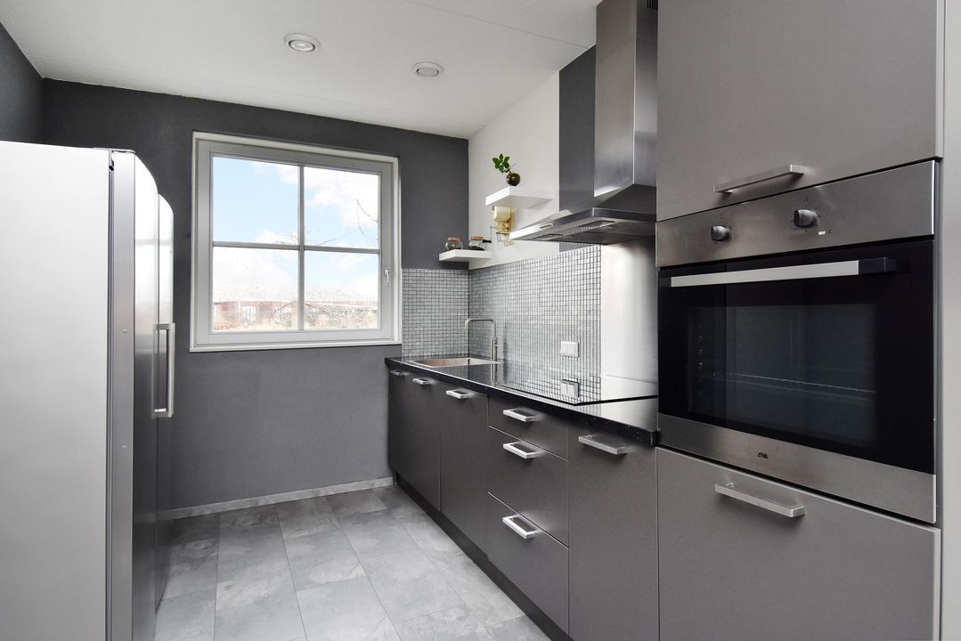 De moderne keuken is aan de voorzijde van de woning gelegen en is uitgevoerd met een kastenopstelling in een strak recht blok met diverse apparatuur waaronder een inductiekookplaat, afzuigkap, oven, vaatwasser en Quooker. Er is een losse koel-vriescombinatie (koelkast functioneert echter niet meer naar behoren). Vanuit de keuken is er een gezellig uitzicht op de straat, het “groen” en de waterpartij.