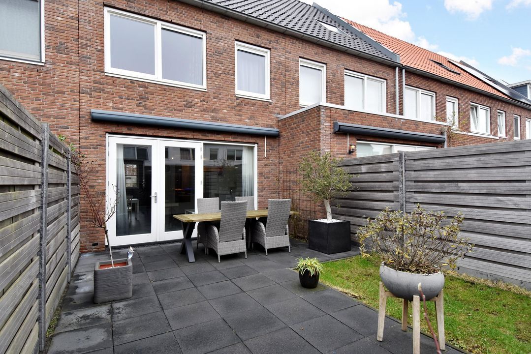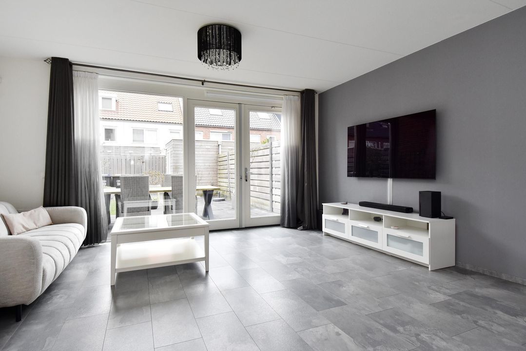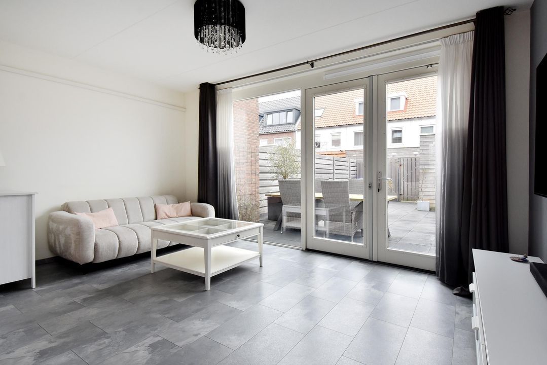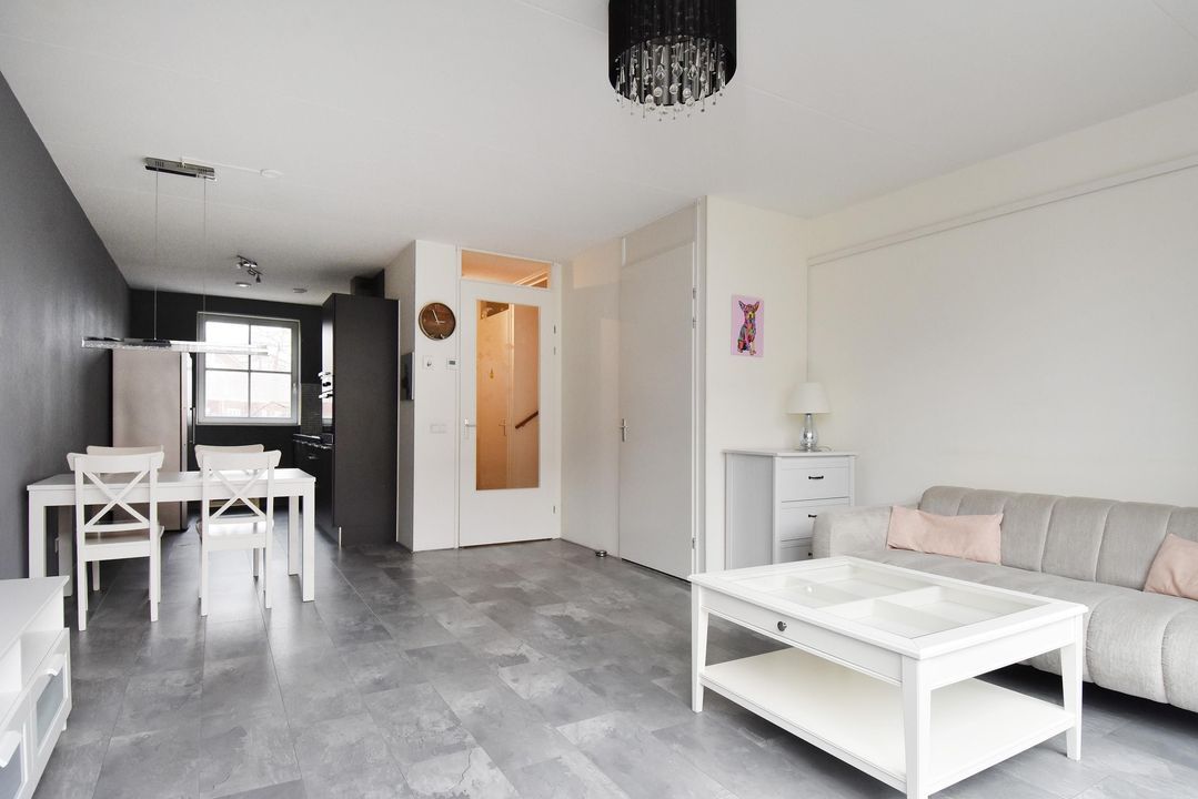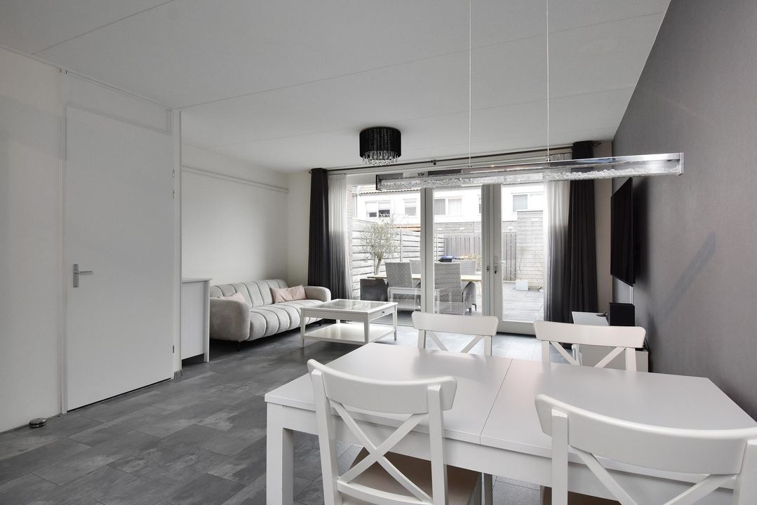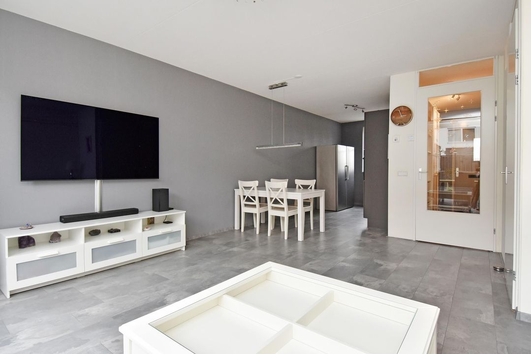 De ruime woon-eetkamer is uitgevoerd met een laminaatvloer en grote raampartijen. Dankzij de vaste kast onder de trap is er voldoende bergruimte. Via de openslaande deuren (houten gevelkozijnen met dubbel glas) is er toegang tot de ruime zonnige achtertuin op het zuidoosten. Deze diepe aangelegde achtertuin is zonnig gelegen en voorzien van ruime schuur alsmede een achterom.