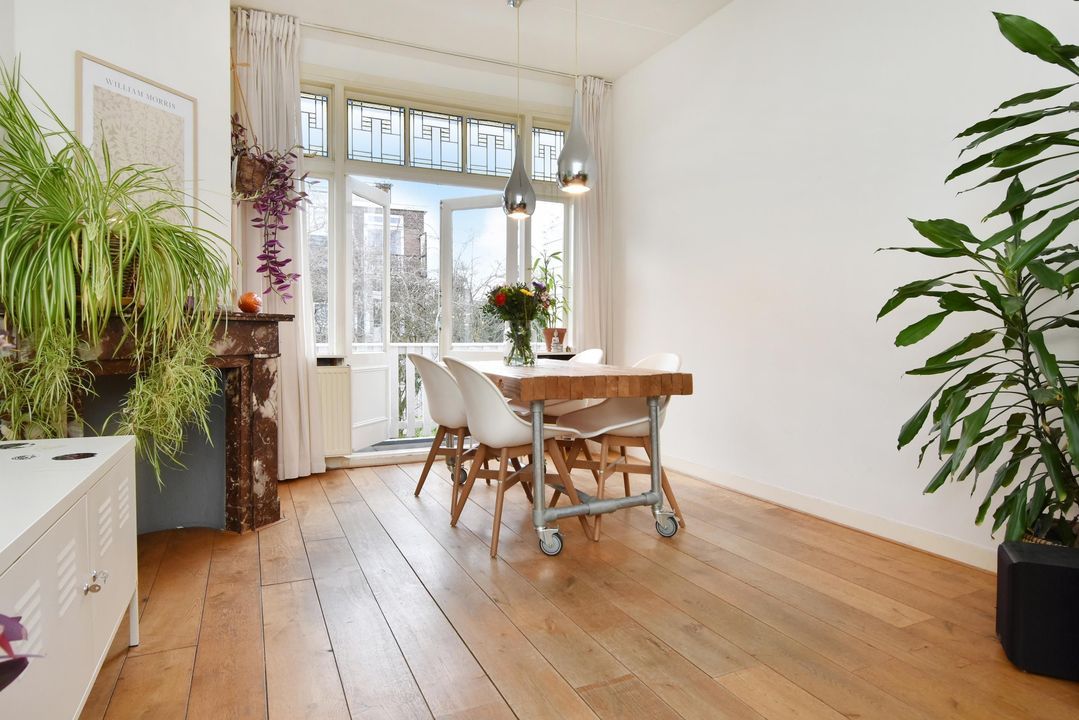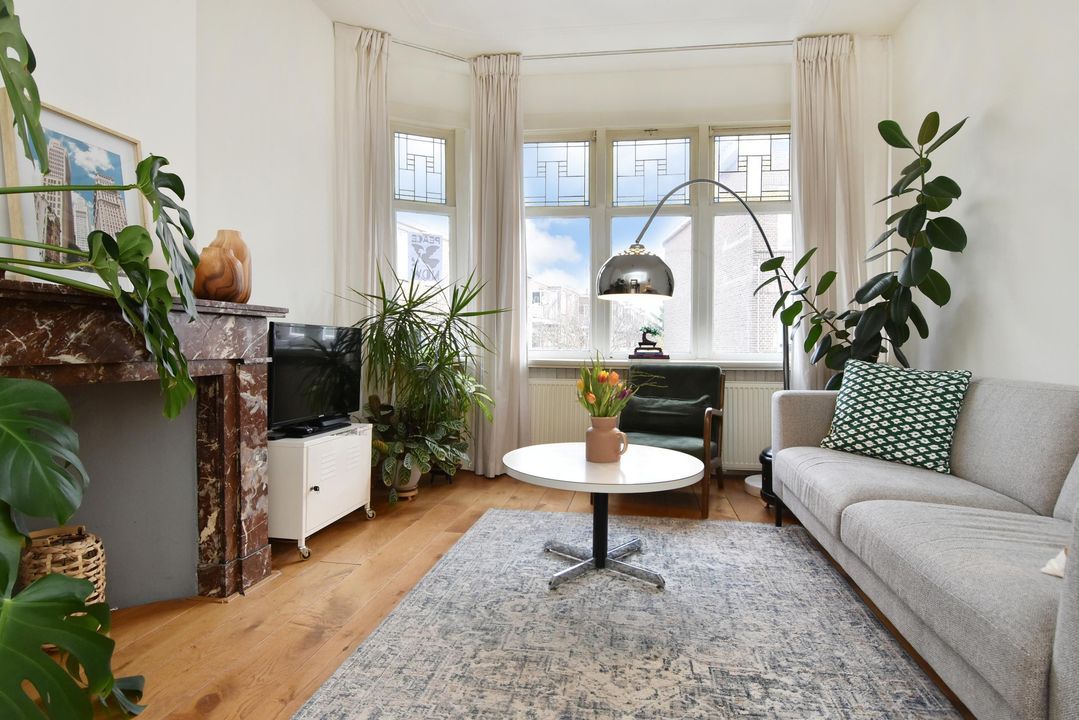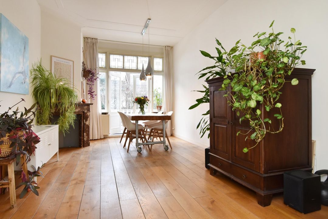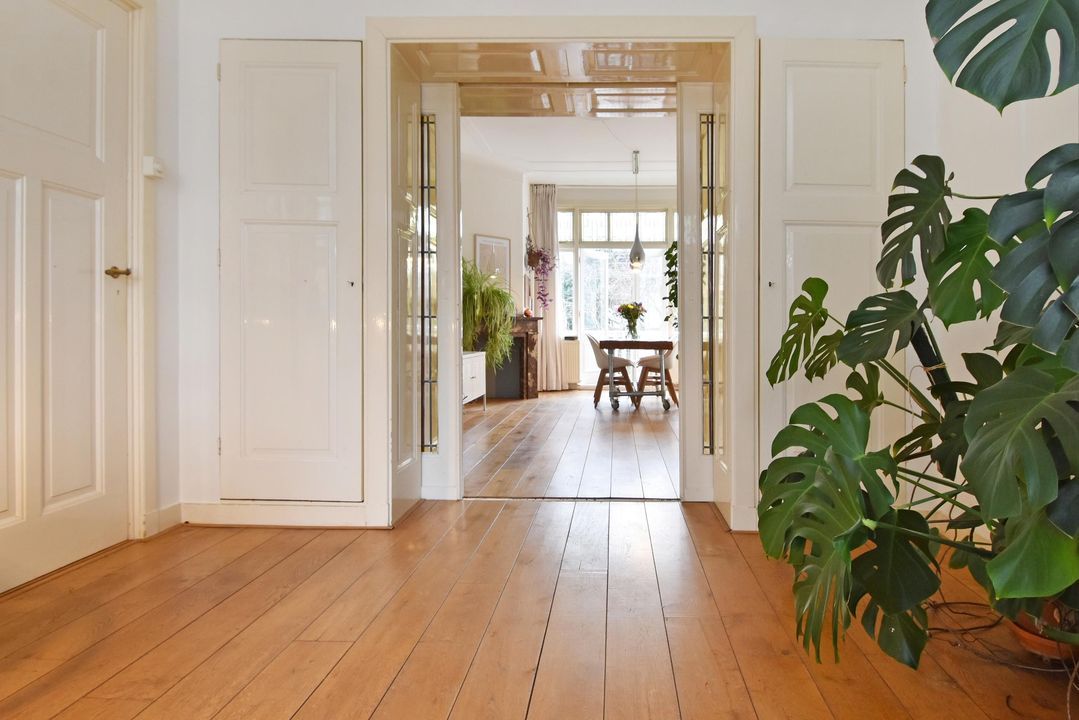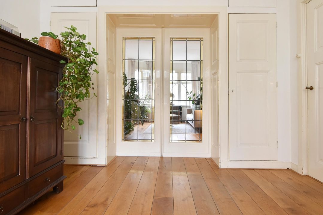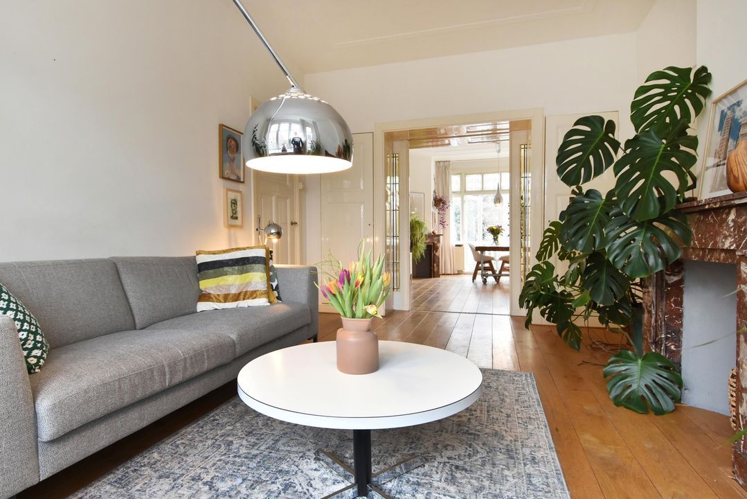 De ruime en vooral lichte ensuite woonkamer met klassieke stijlelementen bestaat uit een voorkamer en een achterkamer. Deze ruimtes zijn van elkaar gescheiden door een suite met vaste kasten en schuifdeuren met glas-in-loodramen.