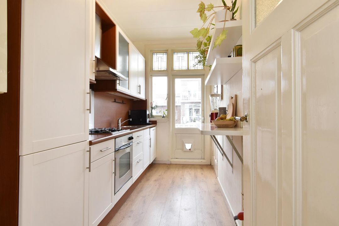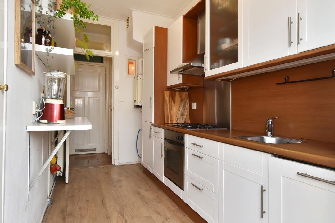De keuken bevindt zich aan de achterzijde van de woning en beschikt over het originele keukenblok en is voorzien van diverse inbouwapparatuur, waaronder een oven, 4-pits gasfornuis, koel-vriescombinatie en vaatwasser.