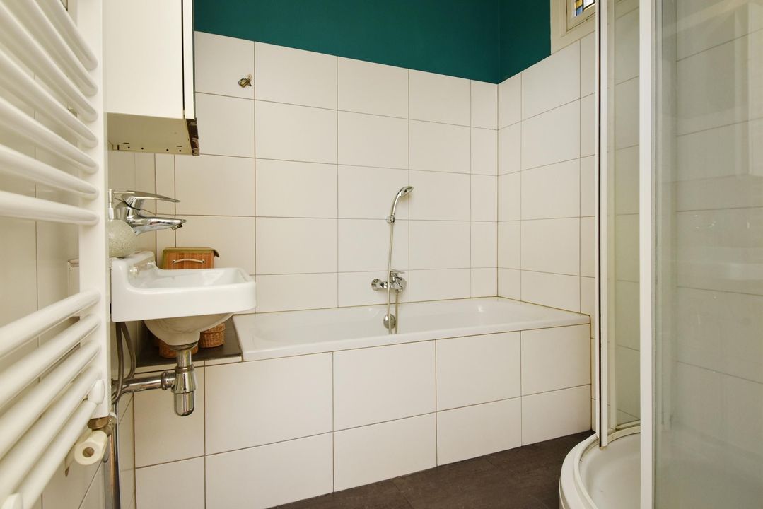 De badkamer bevindt zich aan de achterzijde van de woning en beschikt over een bad, douche en wastafel. Daarnaast beschikt deze badkamer over een tegelvloer en een glas en lood raam.