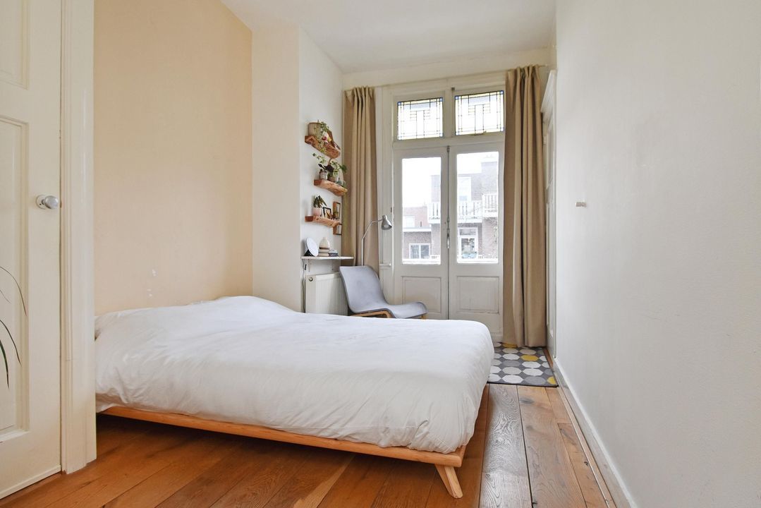 De slaapkamer aan de achterzijde beschikt ook weer over dezelfde beglazing en een warm getinte houten vloer, de kamer beschikt over twee vaste kasten en biedt toegang tot het balkon met openslaande deuren.