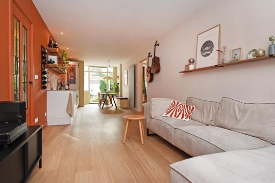 De gezellige woonkamer ensuite beschikt over houten vloeren, hoge plafonds en een suite separatie met glas-in-lood schuifdeuren. In de voorkamer vindt u grote raampartijen met kunststof kozijnen en dubbel glas. Door het zijraam vangt de voorkamer nóg meer licht. Verder vindt u in de voorkamer een marmeren schouw.