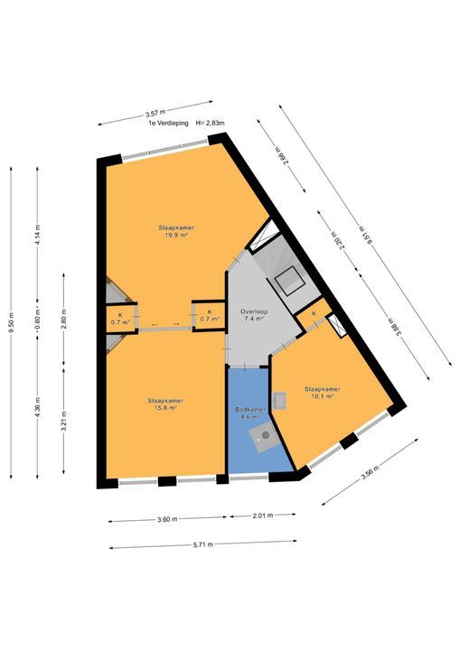 Doordat de woning een hoekligging heeft is de voorzijde deze woning aanzienlijk breder dan aan de achterzijde. Hierdoor is er aan de voorzijde een extra (slaap) kamer waar een ideale badkamerruimte aanwezig is.