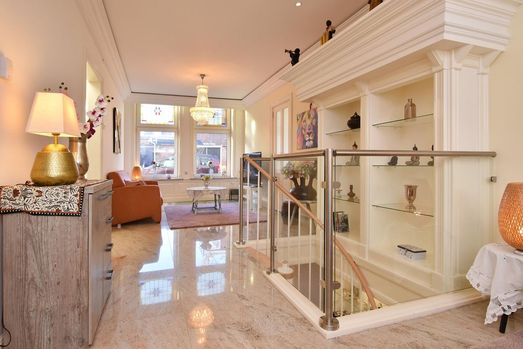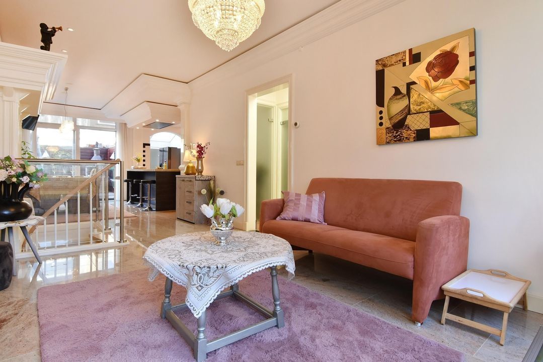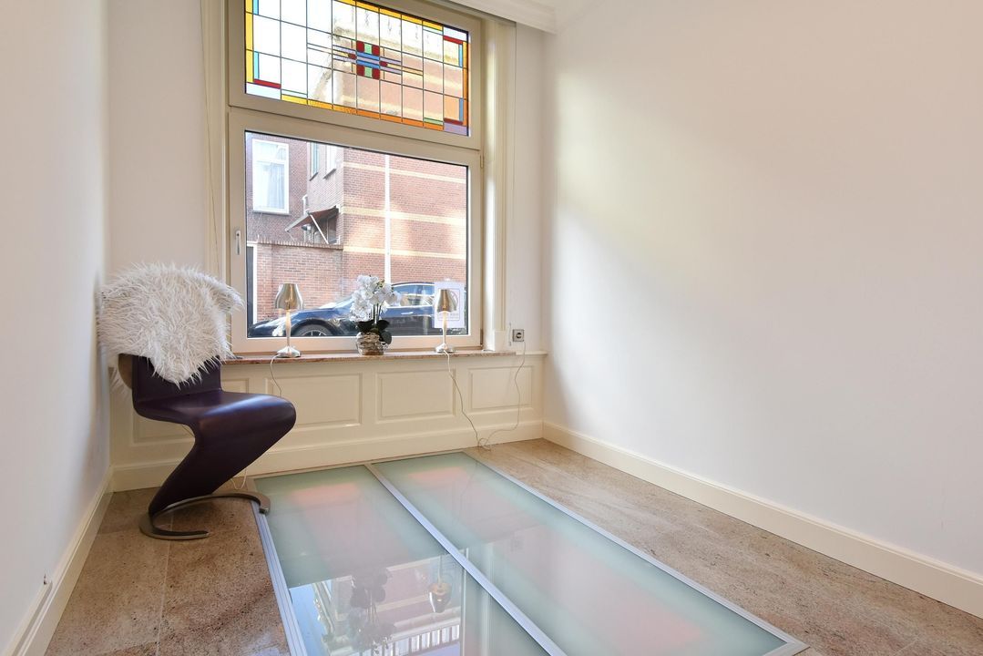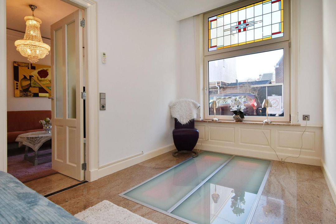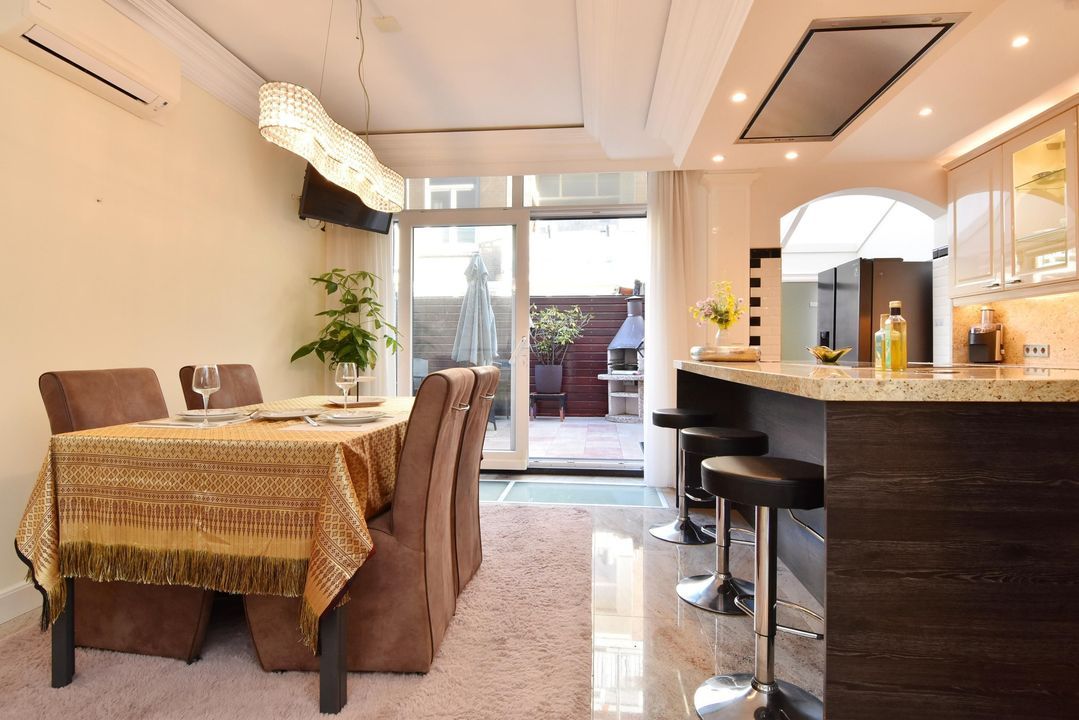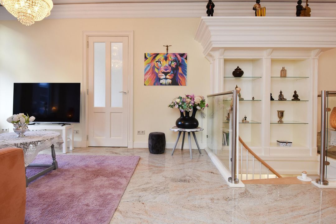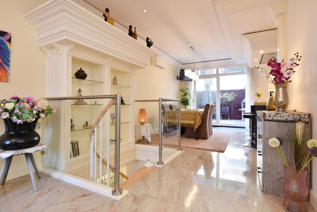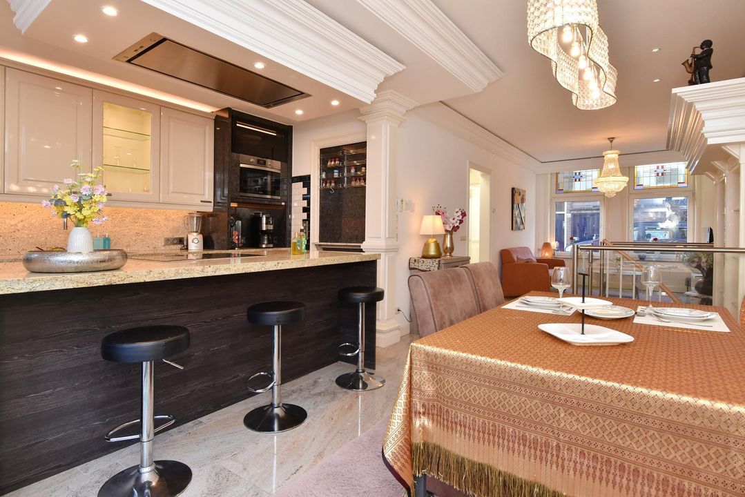 Doorgebroken en hoogwaardig afgewerkte woon-eetkamer met zowel in de voor- als in de achterkamer hardglazen vloerpanelen voor extra daglicht toetreding in het souterrain. In de achterkamer is een fraaie schuifpui met aangenaam veel lichtinval, de achtergevel is voorzien van een Somfi zonnescherm.
