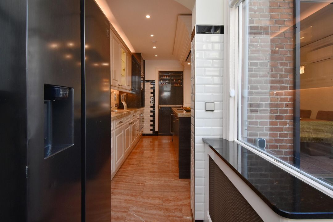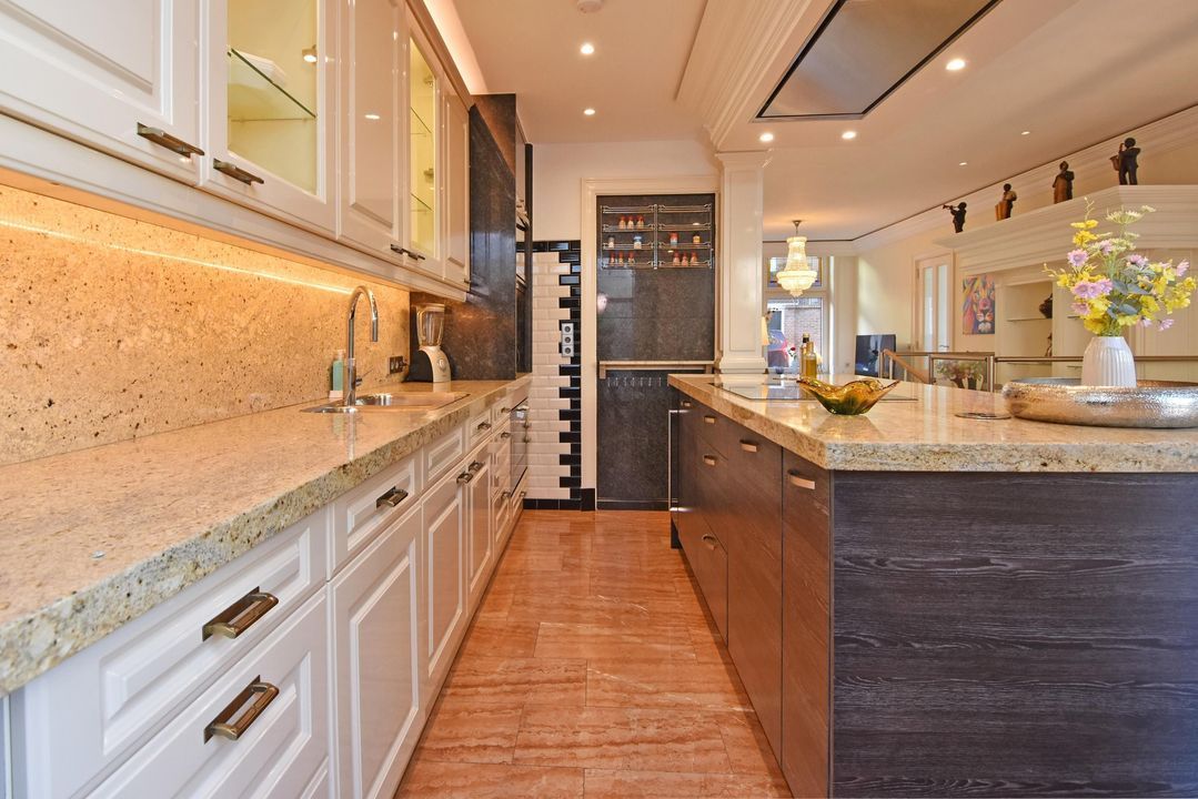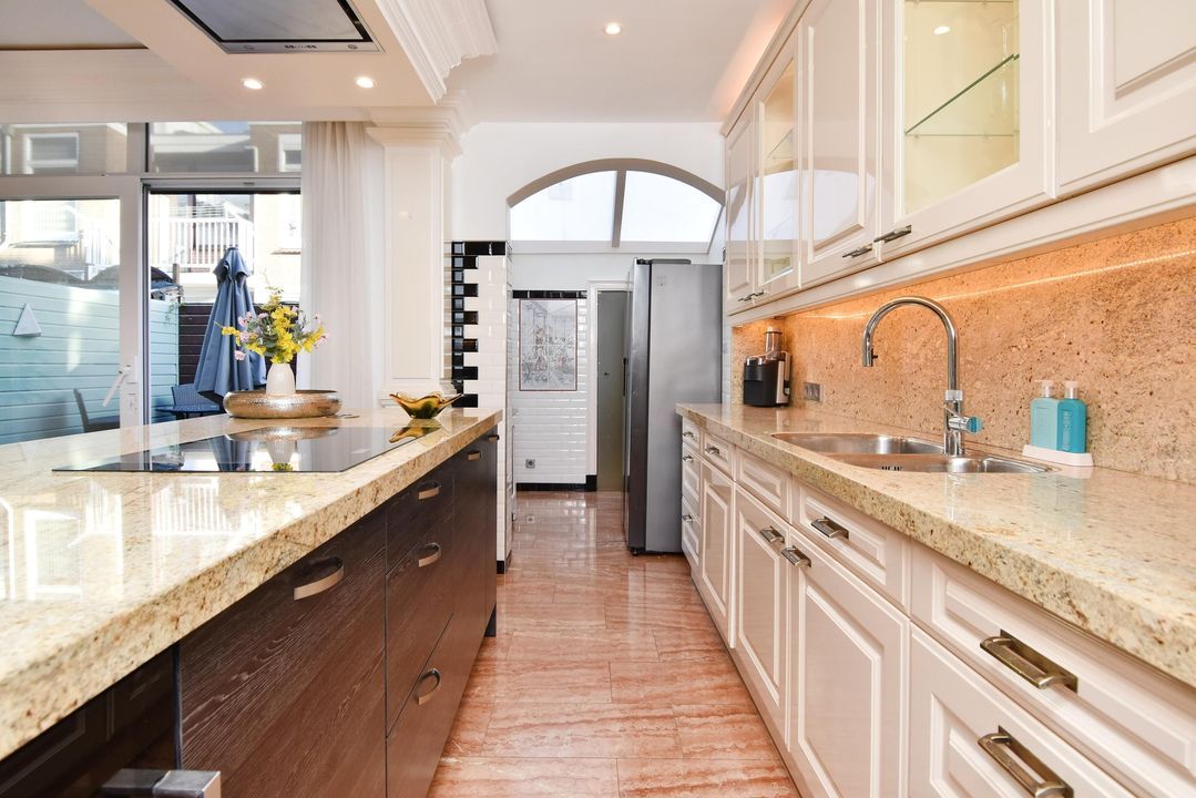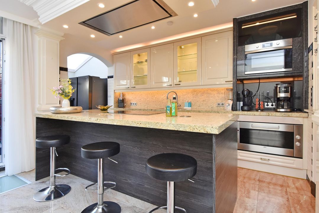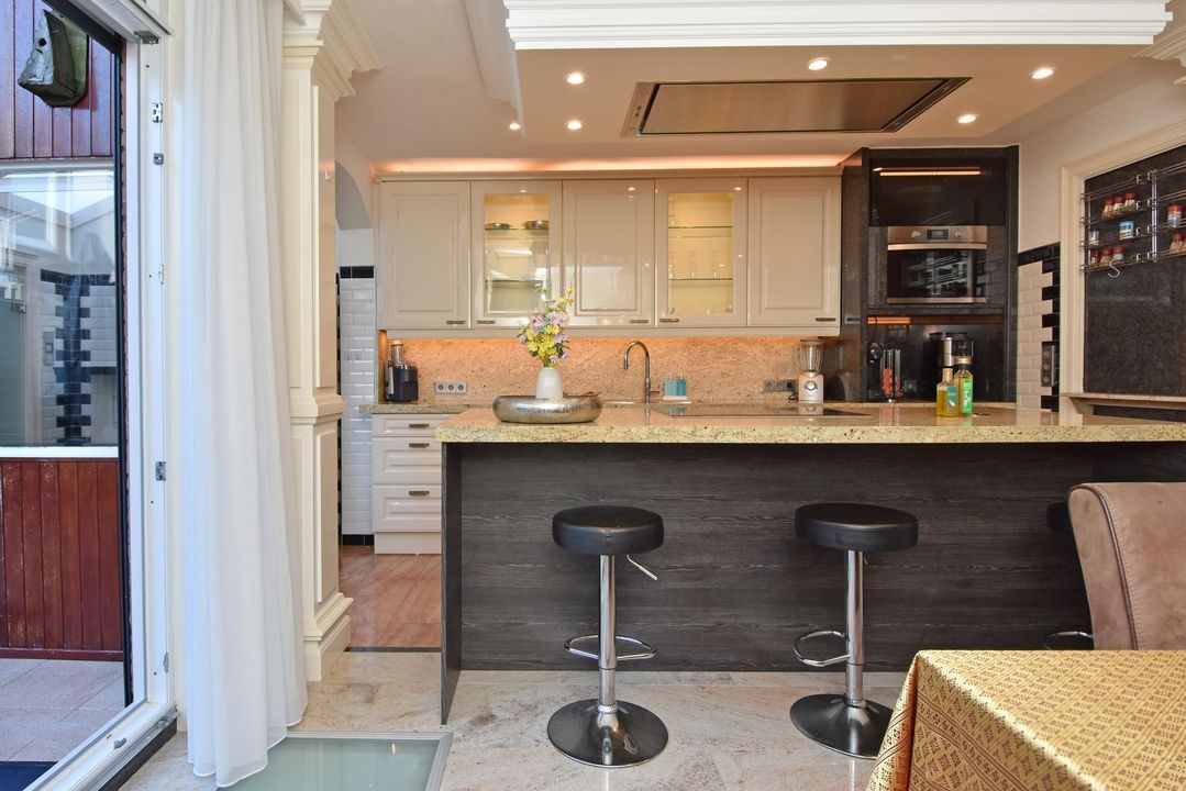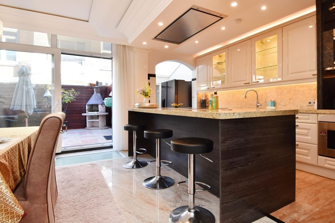 De ruime, luxe open keuken is uitgevoerd met een kook-werkeiland met inductie kookplaat, plafond afzuigkap (geluidsarm), dubbele spoelbak, combi oven-magnetron, brede elektrische oven, Quooker, vaatwasser en een American fridge.