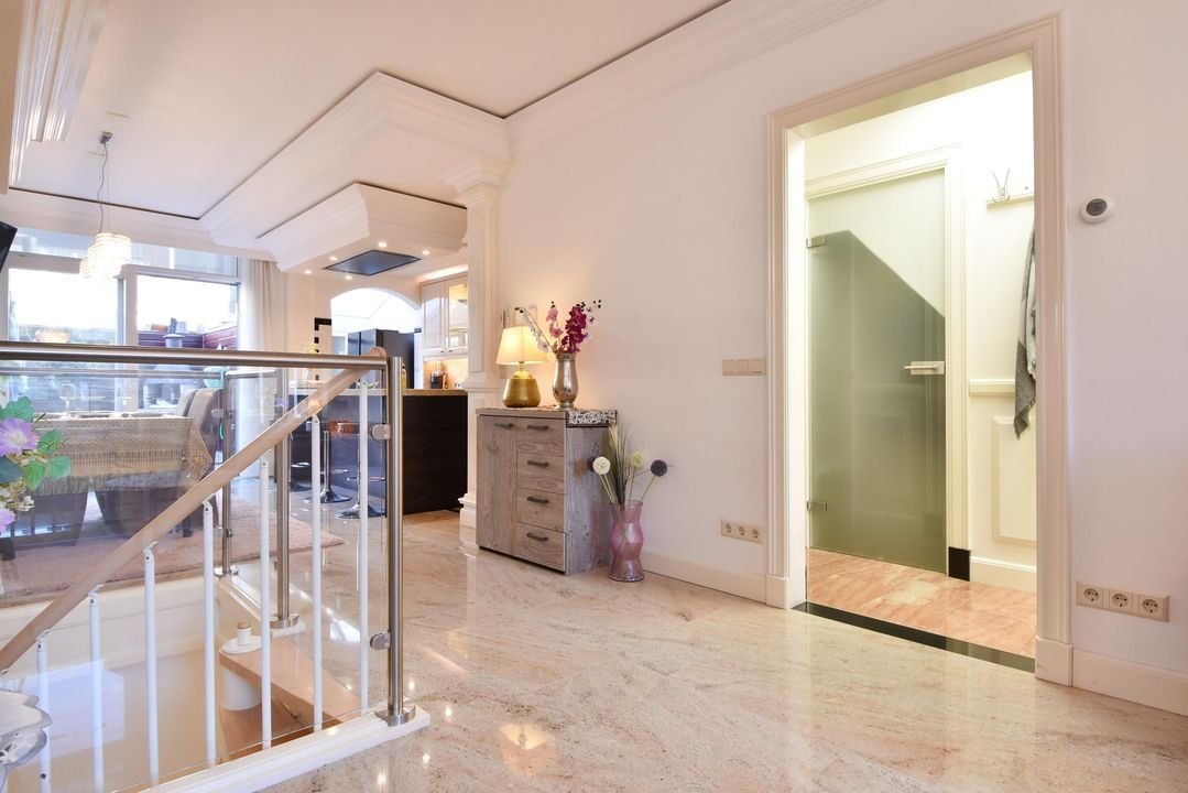 Indeling: via de entree en het tochtportaal heeft u toegang tot de hal met, net als in de rest van deze verdieping, marmeren vloerafwerking. In de hal vindt u een vaste kast waarin zich ook de moderne, zeer uitgebreide groepenkast bevindt met maar liefst 14 groepen, 3 aardlekschakelaars en een aparte 3-fase kookgroep.