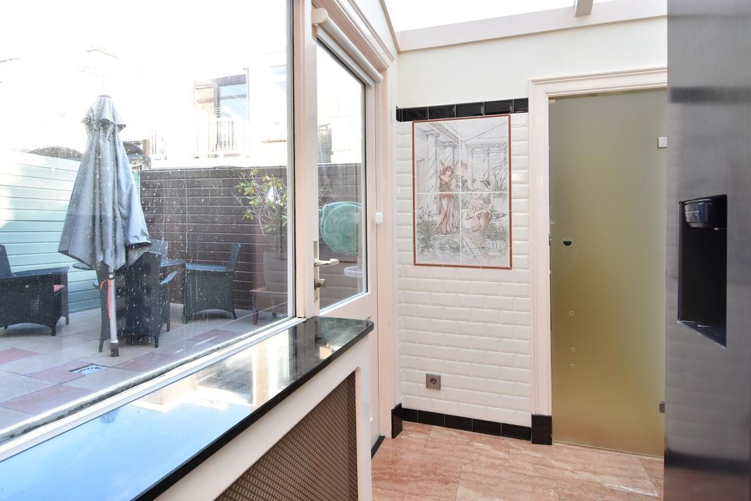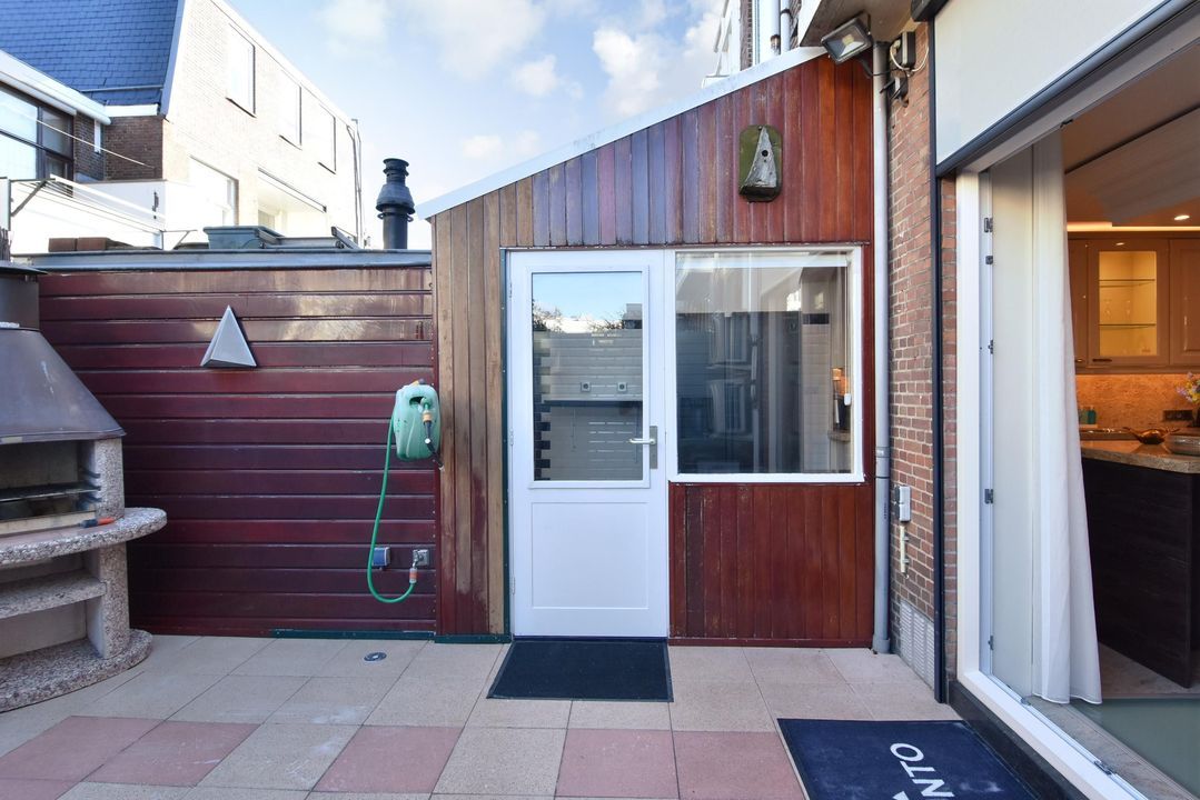De fijne zonnige achtertuin is via de achterkamer en via de bijkeuken te betreden. Tevens is hier de luxe van een vaste barbecue.