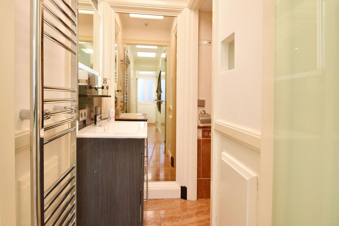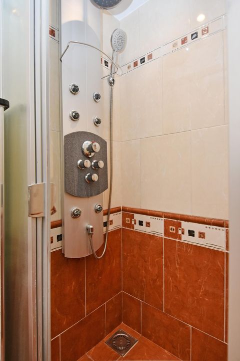 Ook is er vanuit de hal toegang tot de eerste badkamer, voorzien van een wastafel met wastafelmeubel, toilet en douchecabine.