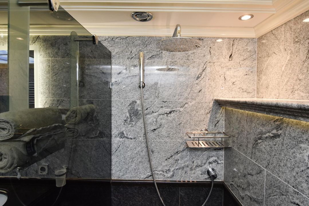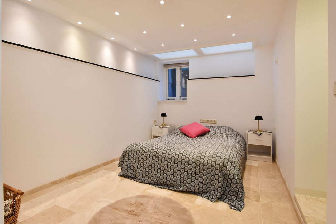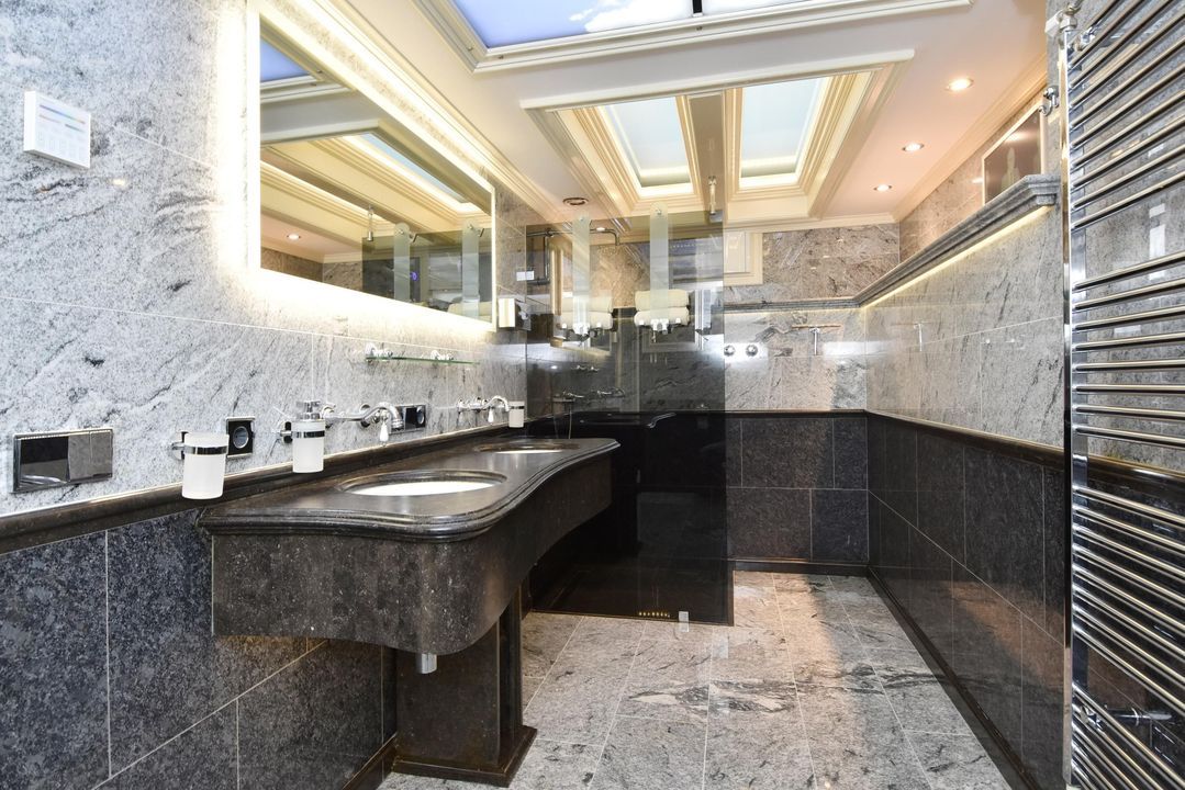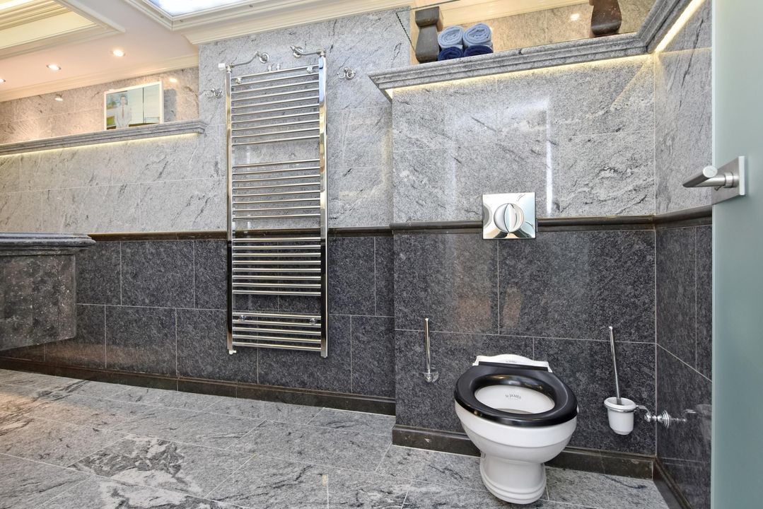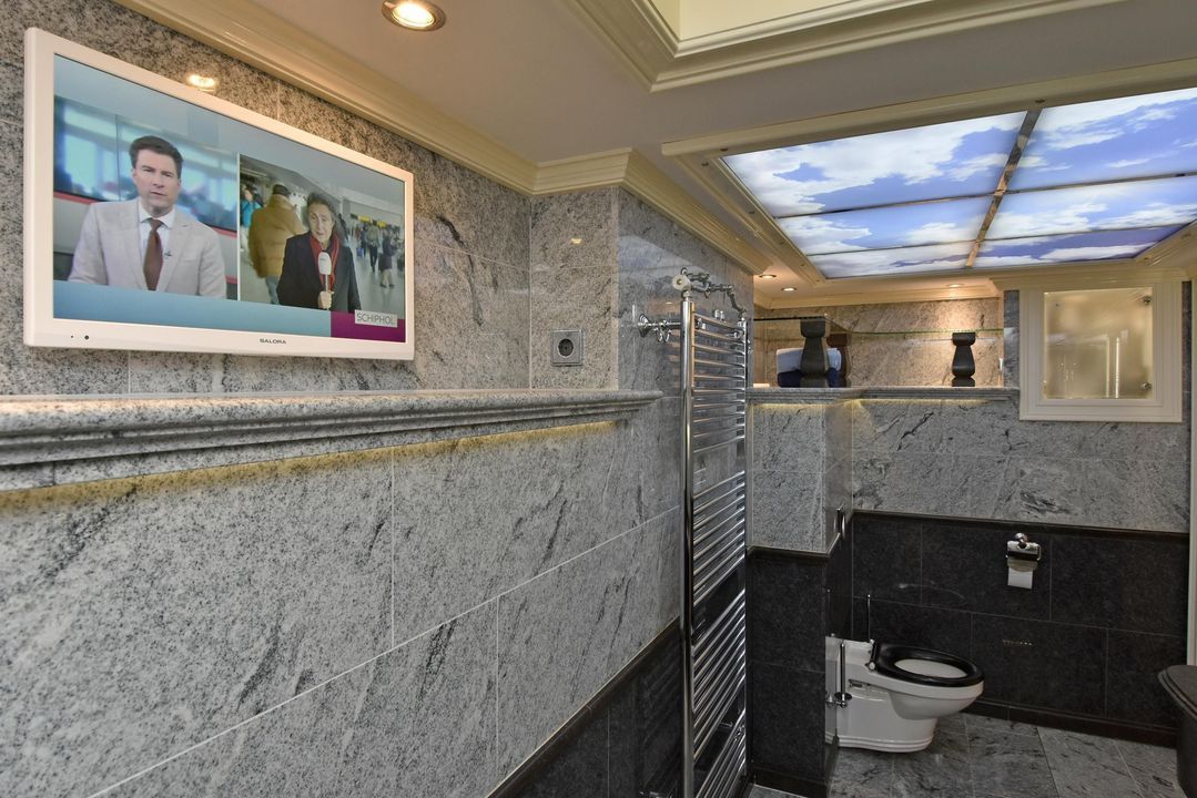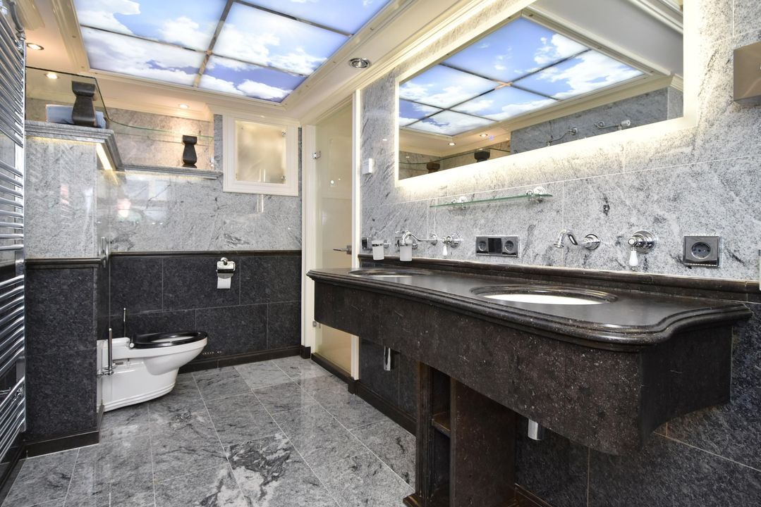Deze gehele verdieping is uitgevoerd met natuurstenen vloerafwerking met vloerverwarming. De ruime centrale hal geeft toegang tot de voorslaapkamer van royale maatvoering. Doorloop naar een eigen, zeer luxe ruime badkamer met fraai wastafelmeubel met dubbele wastafel van Belgisch hardsteen, touchscreen spiegel, televisie, wandcloset (sanibroyeur) en inloopdouche met separate regen-, hand- en voetendouche en regelbare verlichting.