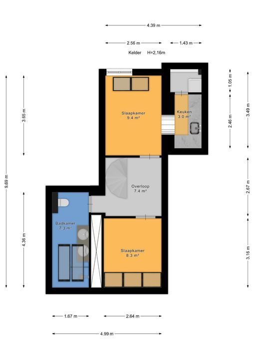 Vanuit de woonkamer is er een wenteltrap die toegang geeft tot het souterrain met de volgende indeling: