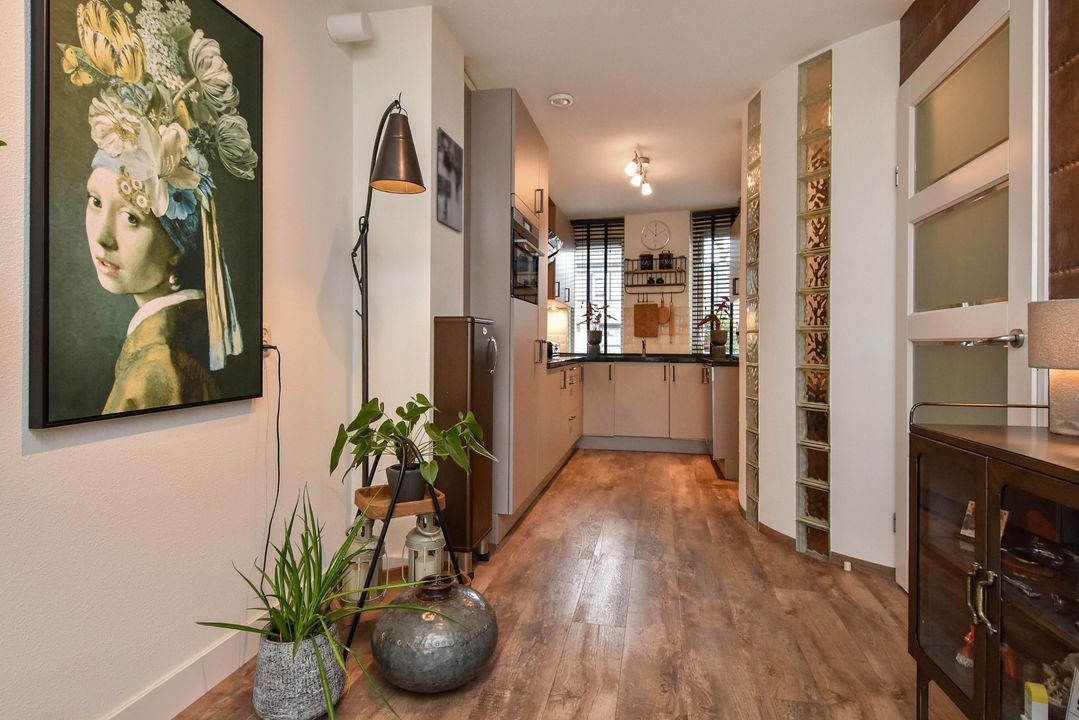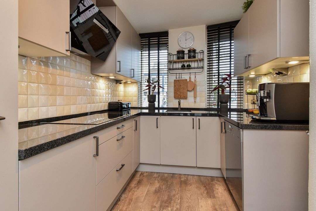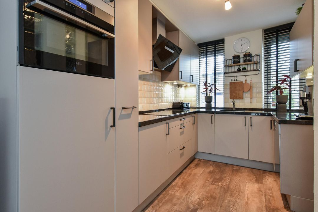 Aan de voorzijde van de woning bevindt zich de open keuken in een U-opstelling met een extra diep natuurstenen werkblad, inductiekookplaat met afzuigkap (Bosch), vaatwasmachine (Miele), combi oven/magnetron (AEG), koel/vriescombinatie (Bosch).