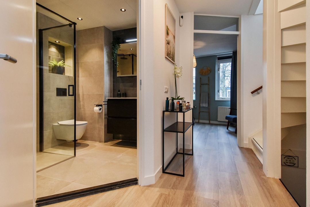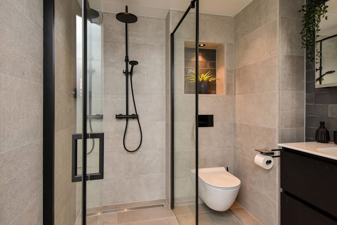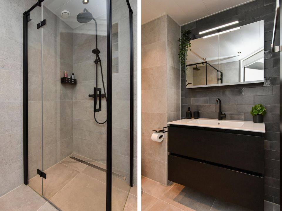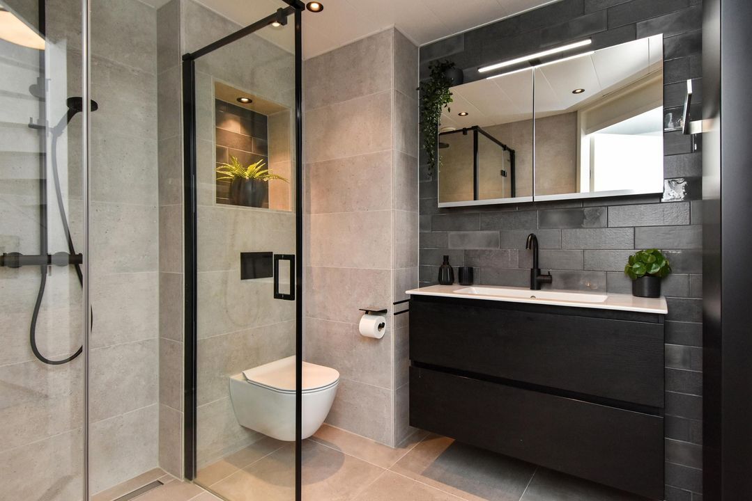 De tussengelegen moderne en luxe badkamer (2023) is voorzien van een inloopdouche met zwart aluminium scherm met glas, 2e toilet, wastafelmeubel met fraaie spiegelkast met verlichting alsmede een zwarte design handdoekradiator.