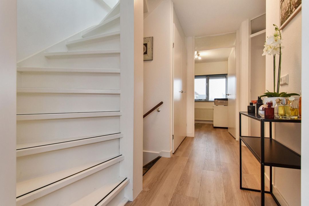 Toegang via voortuin met bestrating, beplanting en buitenkraan. Entree woning. Hal met meterkast met 7 groepen en aardlekschakelaar, gas en wateraansluiting (in de kruipruimte hebben verkopers een waterontharder laten plaatsen hetgeen ideaal is, nooit meer kalkaanslag). Toilet met fonteintje, uitgebouwde trap-/voorraadkast, trapopgang naar 1e verdieping en doorloop naar de woon-/eetkamer.