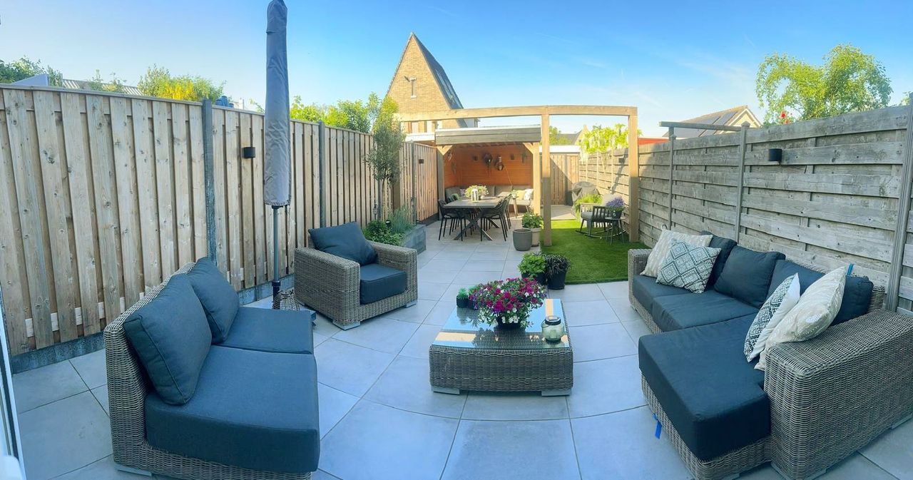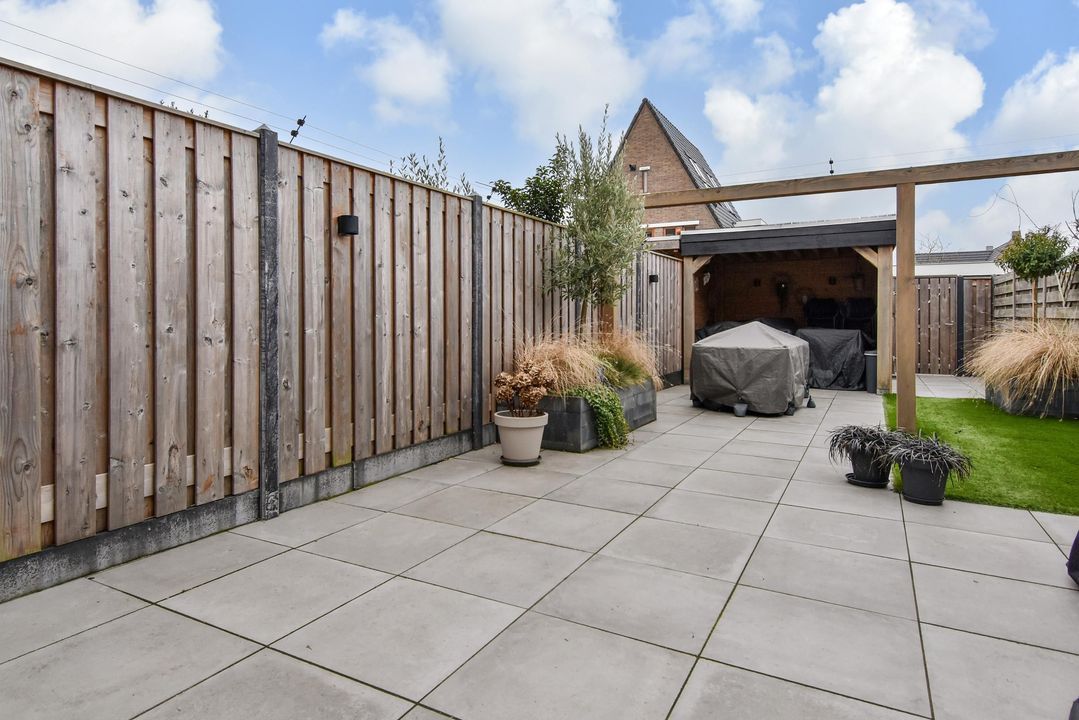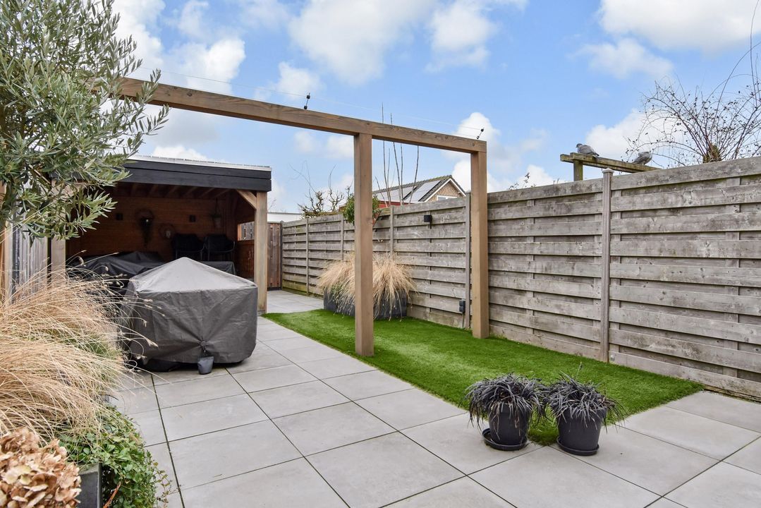 Zonnige achtertuin gelegen op het zuidwesten met bestrating, beplanting, buitenkraan, een gezellige houten overkapping om tot in de late uurtjes van de tuin te kunnen genieten alsmede een zeer royale berging v.v. elektra. Tevens een achterom aanwezig zodat u de fietsen direct in de schuur kunt stallen.